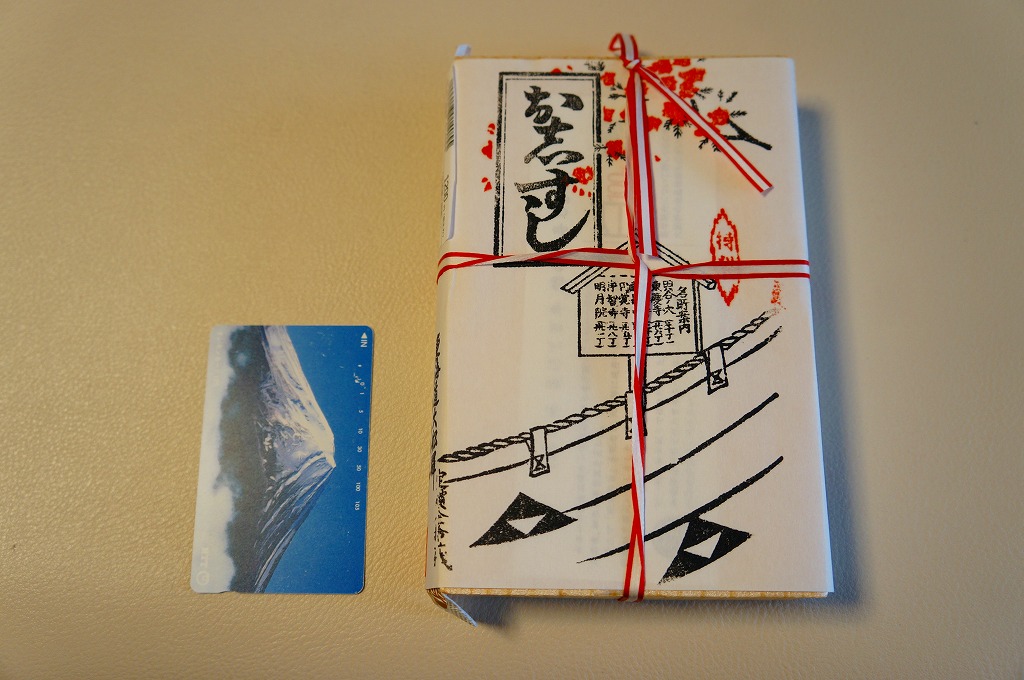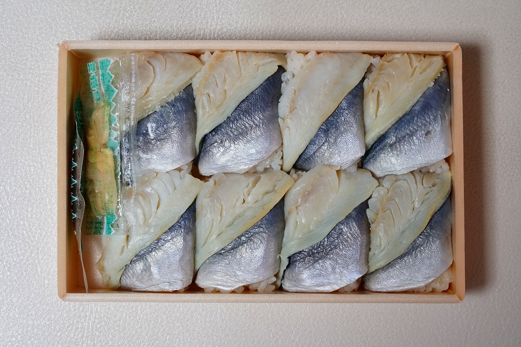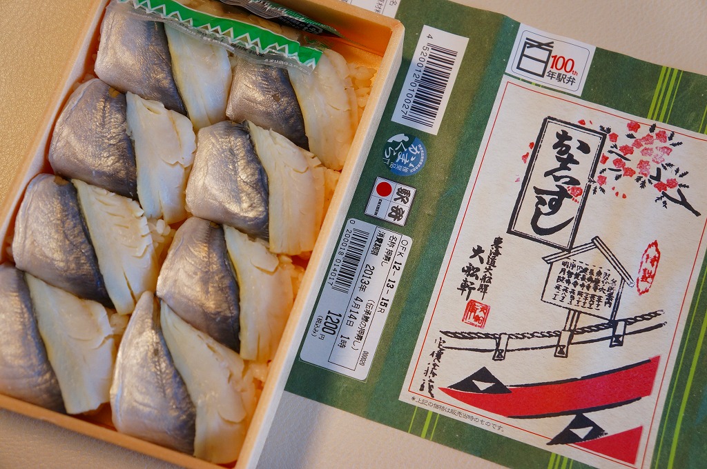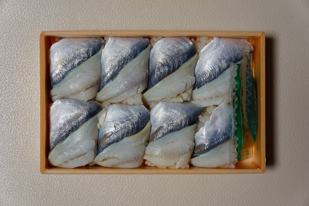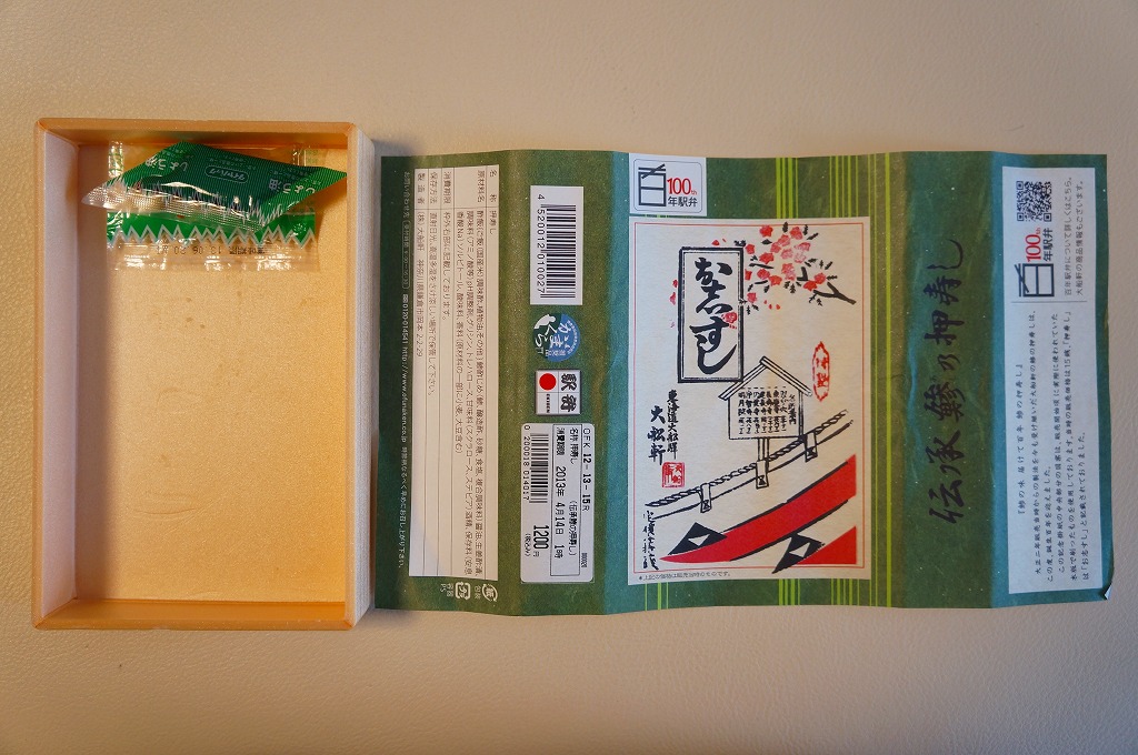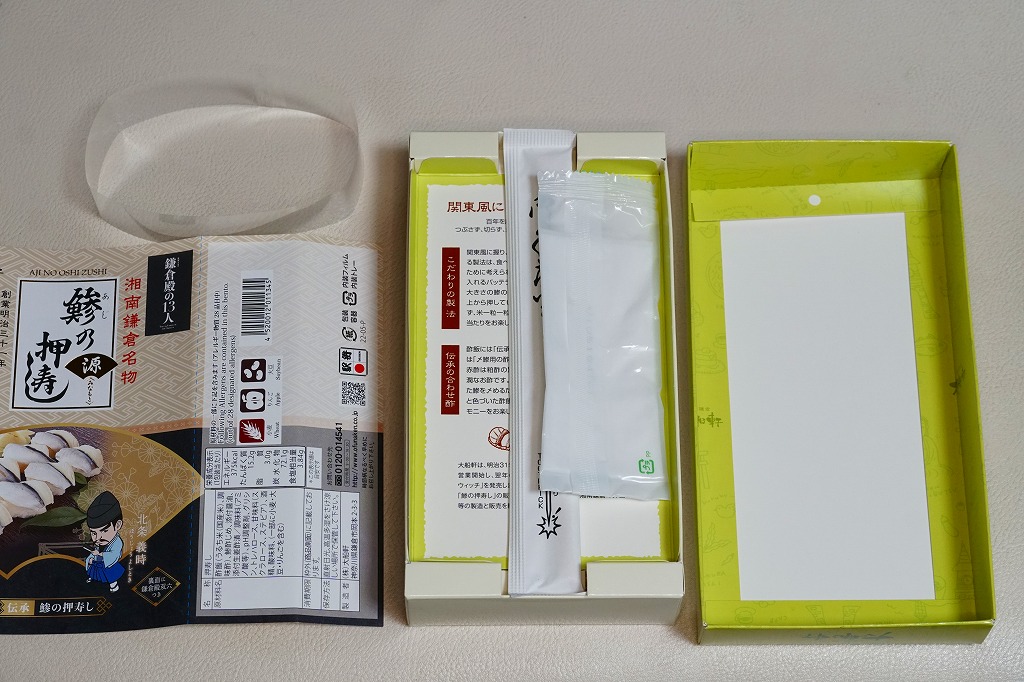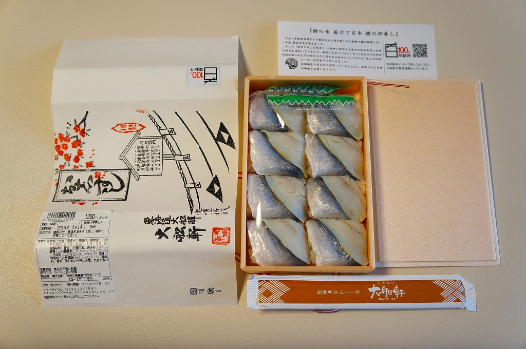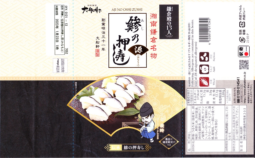 1913(大正2)年4月に大船駅で発売。汽車の時代から東海道線や横須賀線の旅客に、鎌倉の文人や大船の映画人などに愛された、伝統の駅弁。2023年の4月末までに使い始めた紙容器に、抹茶色あるいは竹色に見本写真と商品名を美しく描いた掛紙を巻く。掛紙の裏面で鯵の押寿しの歴史を、中ぶたでその特徴を、多くの文字で紹介する。
