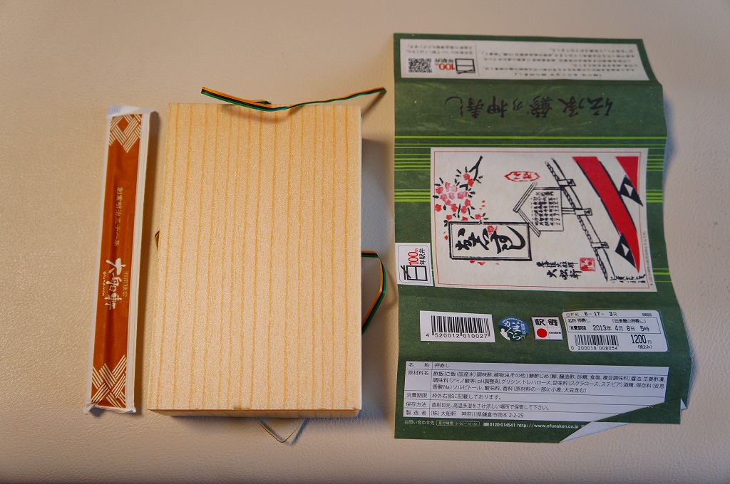 2012(平成24)年7月19日に購入した、大船駅弁のスリーブ。同年同月のリニューアルにより、ここのこの駅弁でも掛紙の使用をやめ、ボール紙の枠に容器をはめる形になった。このほうが安くて合理的なのだろう。昔からの駅弁ファンはがっかり。