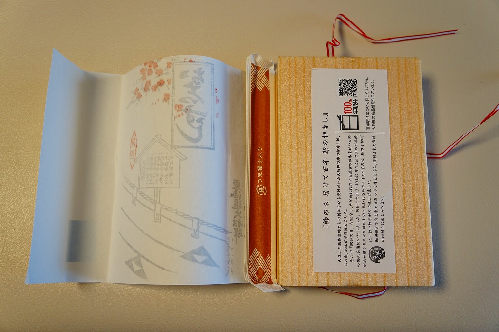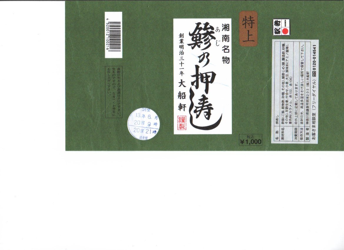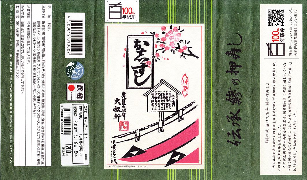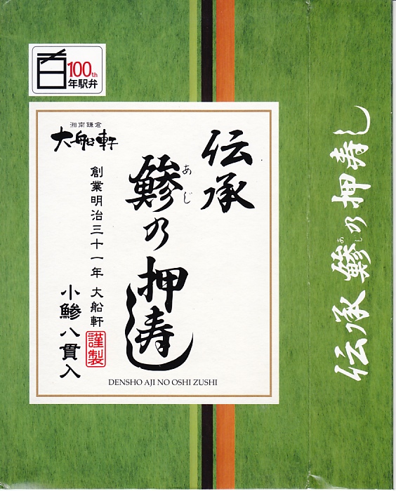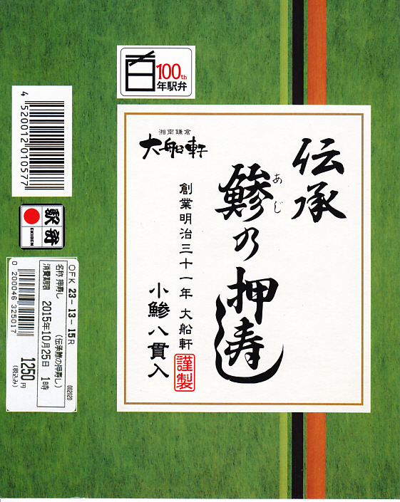 2013(平成25)年4月13日に購入した、大船駅弁の掛紙。大船駅弁「鯵の押寿し」誕生百年を記念して、2013年4月10日から14日まで、大船駅と東京駅で300個ずつが、調製元が保管していた百年前の版木で刷った和紙の掛紙を使い販売された。それなのに食品表示ラベルとリサイクル識別表示マークと百年駅弁のロゴのシールを、掛紙そのものに貼ってしまったのは残念。価格と中身は通常版と同じ。