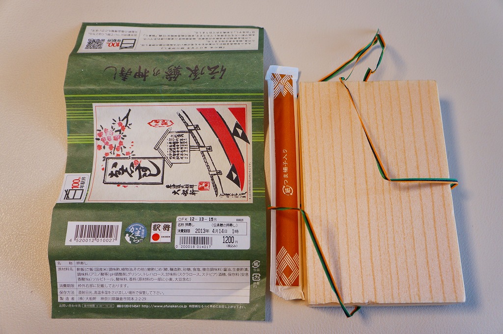 2013(平成25)年4月7日に購入した、大船駅弁の掛紙。上のものとまったく同じはずが、こちらは法定のリサイクルマーク「紙」「プラ」がついていないエラー掛紙。