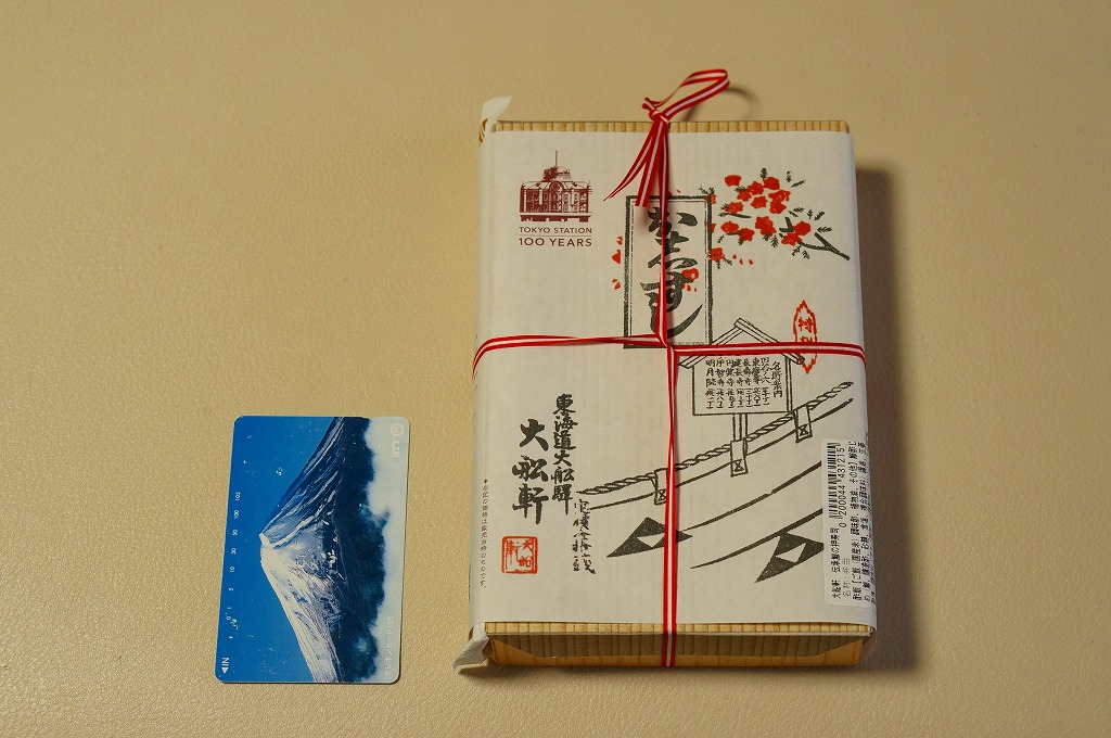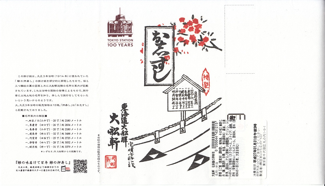 2015(平成27)年1月31日に購入した、大船駅弁の掛紙。下の2013年4月と同じ、1914(大正3)年当時に使われていた絵柄の掛紙を使い、アイコンと解説文で東京駅の開業100周年を記念した。価格と中身は通常版と同じ。東京駅の駅弁売店で実演販売されたので、調製元が日本レストランエンタプライズになっている。