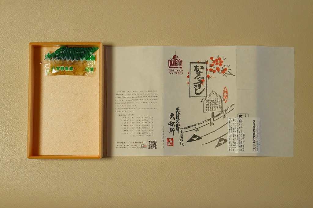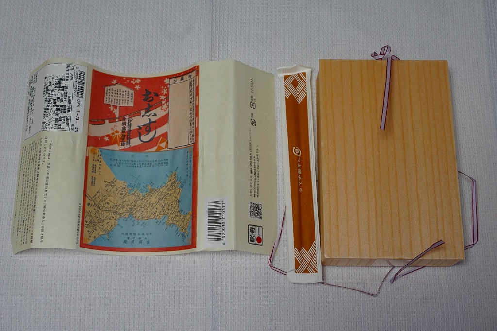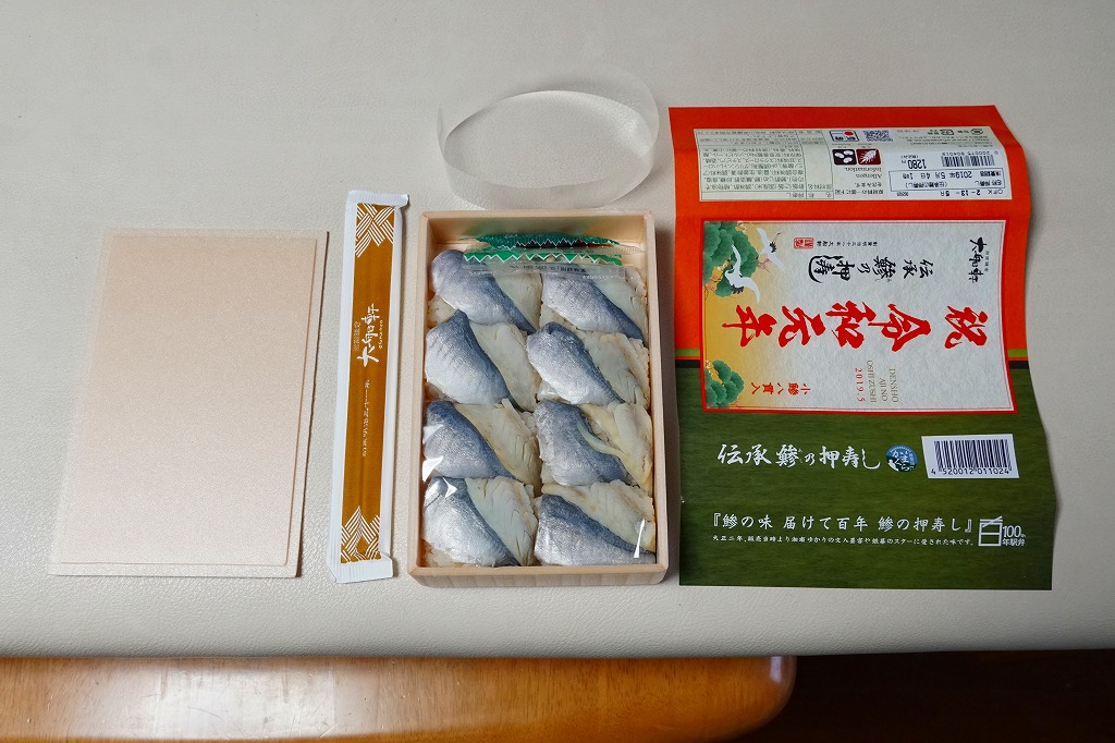 大船駅弁「伝承鯵の押寿し」の復刻版というが、下記にある以前のものと同じく、中身は上記の通常版と同じで、掛紙に昔のものの絵柄を取り入れた。今回はその絵柄も、5年前の2017年10月から11月までのときと同じ大正7年頃のもので、これをなぜか色を薄めて使う。酸味の強い、半身の小アジの握り風の押し寿司。