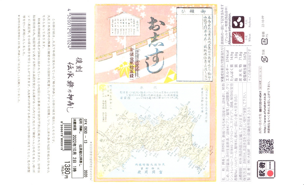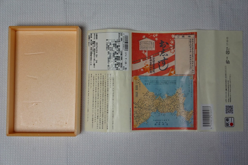 2017(平成29)年10月8日に購入した、大船駅弁の掛紙。同年秋のJR東日本の駅弁キャンペーン「駅弁味の陣2017」へのエントリーに合わせて同年10月から11月まで、1918(大正7)年頃に使われていた掛紙の絵柄を取り入れた、この掛紙を巻いて販売された。価格と中身は、通常版と同じ。1899(明治32)年から1945(昭和20)年まで法定の要塞地帯であった三浦半島の地図が、東京湾要塞司令部の許可のもと、掛紙に描かれている。