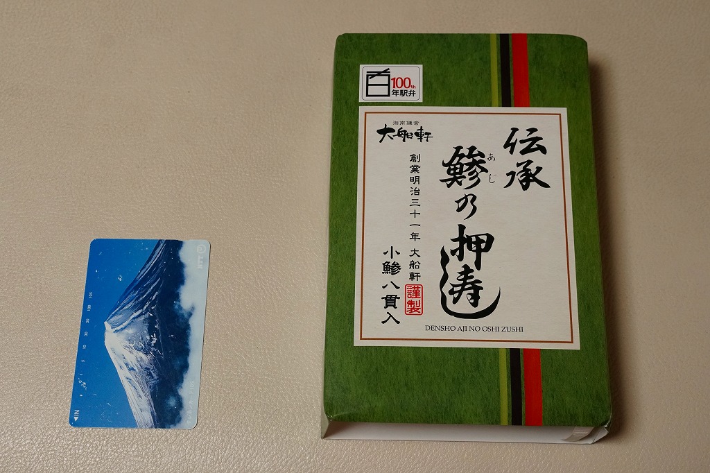 2005(平成17)年2月26日に発売された、同年8月末頃までの期間限定駅弁。とても小さな長方形の容器に木目調の紙のふたをして、掛紙をかけて紙ひもでしばる。中身は大船駅弁名物「鯵の押寿し」が4個だけ入るもの。一日100個程度の限定販売。