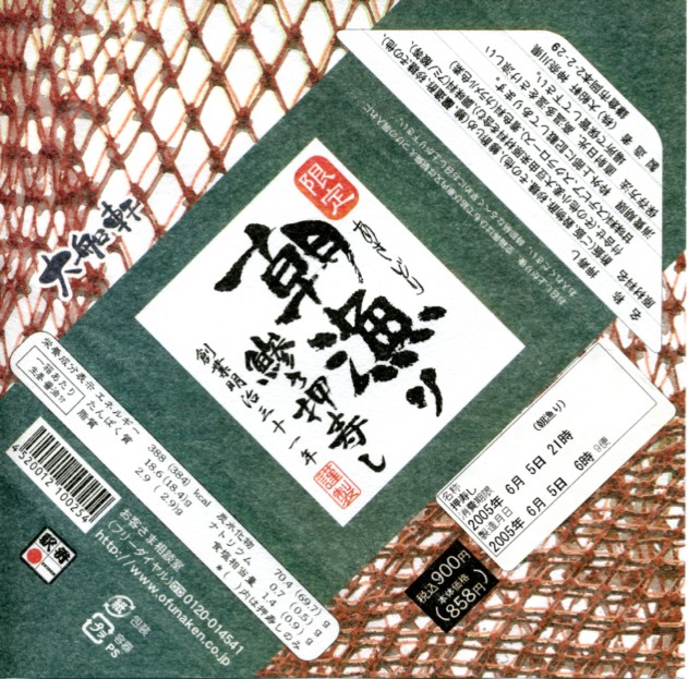 2002(平成14)年11月5日の調製である、大船駅弁の掛紙。これは駅ではなく、デパートやスーパーで販売されたもの。容器や中身は駅で買えるものとまったく同じだが、掛紙に記載された定価が、税込価格1,000円ではなく税抜価格953円であり、駅弁マークの位置や成分表示の有無など細かい点で異なる。駅売りの駅弁に割引はないが、ここではスーパーの閉店直前で半額にて買えた。