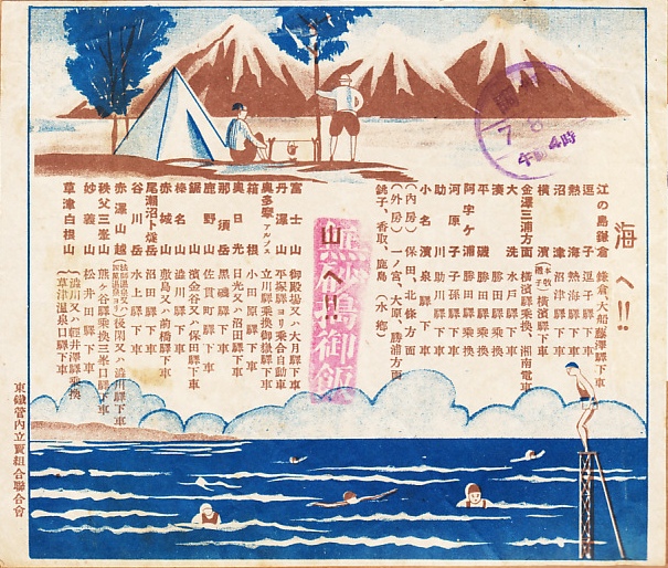1932(昭和7)年8月8日4時の調製と思われる、昔の大船駅弁の掛紙。おかずの掛紙には、富士、箱根、伊豆を背景に、大船駅から鎌倉や江ノ島などの行楽地への交通案内が描かれる。大船駅と鎌倉山と江ノ島口と長谷を結ぶ実線には「日本最初ノ自動車専用道路」と付記。御飯の掛紙は鉄道省の東京鉄道局管内の各社で共通のものと思われ、無砂搗(むさつき)御飯の判を押したうえで「海へ!!」「山へ!!」として管内の観光地30箇所以上を列記する。