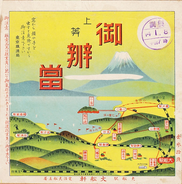 1938(昭和13)年2月19日7時の調製と思われる、昔の大船駅弁の掛紙。富士を背景に大船駅から鎌倉や江ノ島などの行楽地への交通案内を描く絵柄は、下記の1932年8月のものと共通するが、その構図は変えられ、藤沢駅からの江ノ島電車や小田急のルートが図に加わった。