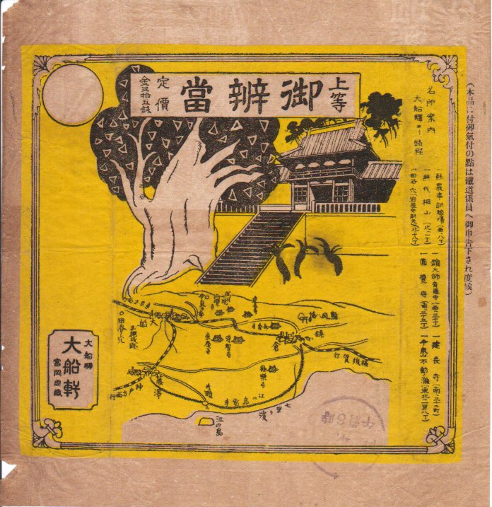 1925(大正14)年4月14日6時の調製と思われる、昔の大船駅弁の掛紙。35銭の価格から1939(昭和14)年でないと考えたが、紙質の悪さから昭和の戦時の駅弁掛紙かもしれないし、1929(昭和4)年4月開通の小田急江ノ島線は未開通か描画省略か。上半分の絵柄は、鶴岡八幡宮の本宮(上宮)と大銀杏か。下半分には大船、鎌倉、江ノ島エリアの鉄道路線図を描く。