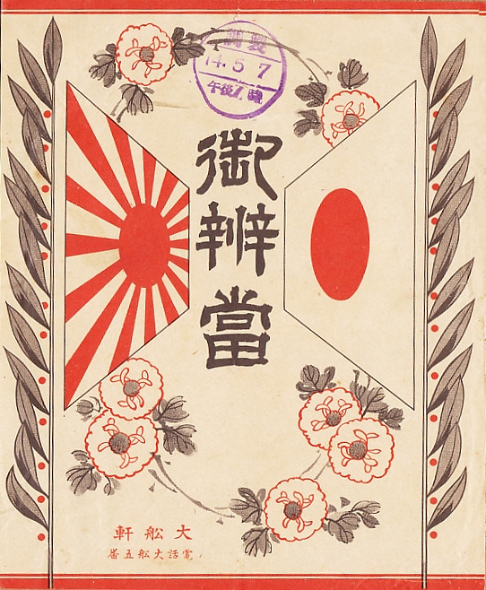 1939(昭和14)年5月7日19時の調製と思われる、昔の大船駅弁の掛紙。鉄道に関する記述がないため、仕出し弁当向けの掛紙かもしれない。日の丸と旭日旗を対面されて何かを記念するように見えて、何を記念したのかは分からない。