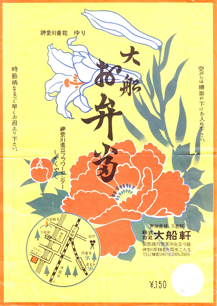 1963(昭和38)年12月30日の調製と思われる、昔の大船駅弁の掛紙。花の絵柄は汎用でなく、県花ゆりとバラ園で神奈川県立フラワーセンターであり、そのアクセスマップも記される。1962年7月に開園し、今も日比谷花壇大船フラワーセンターの名で県有施設として現存する。
