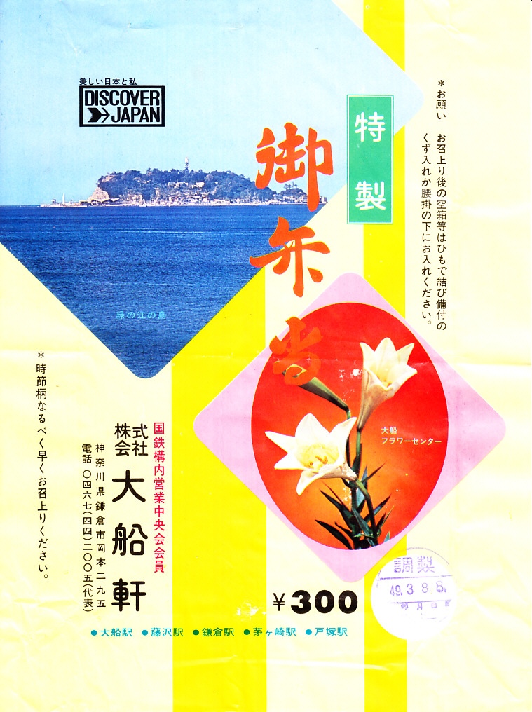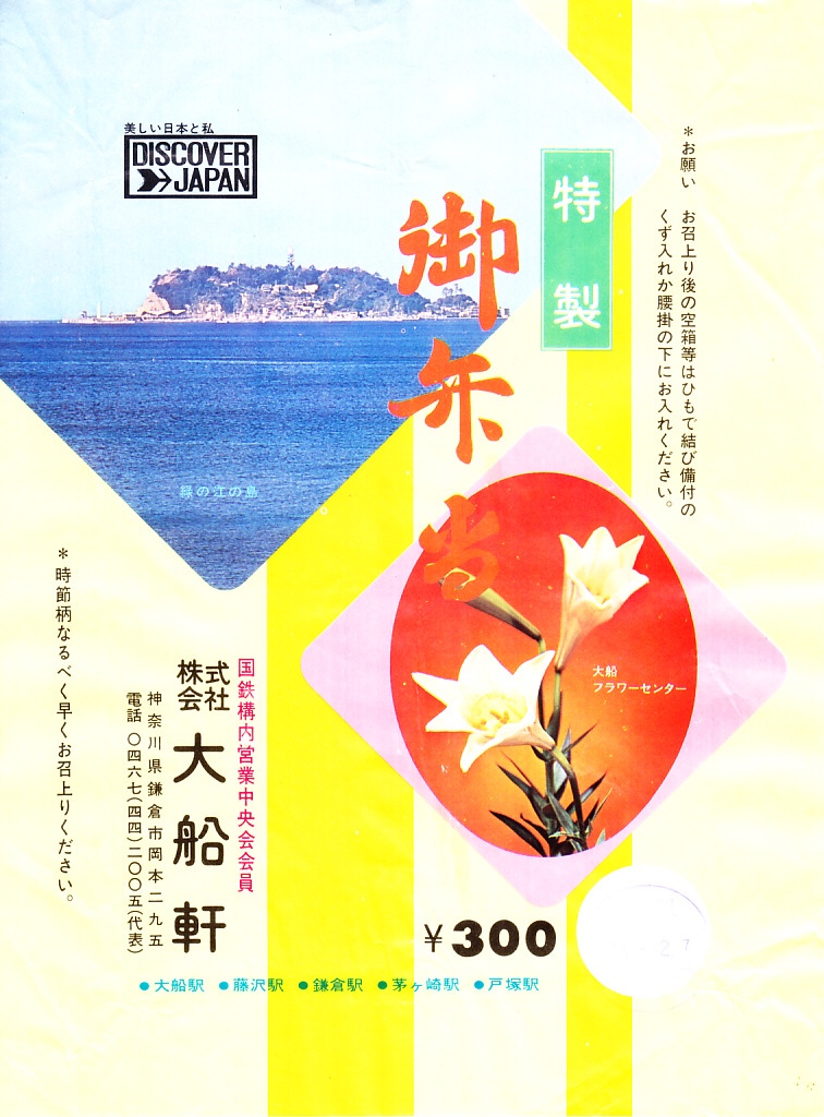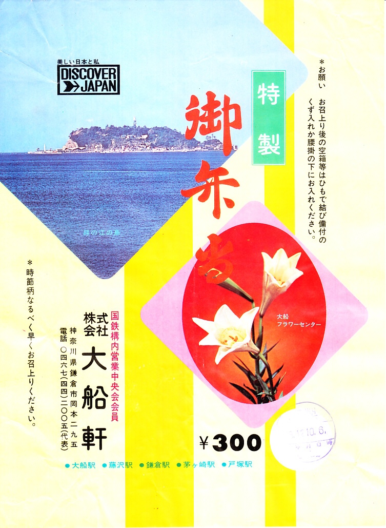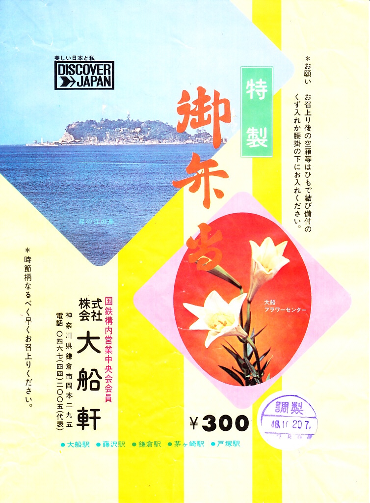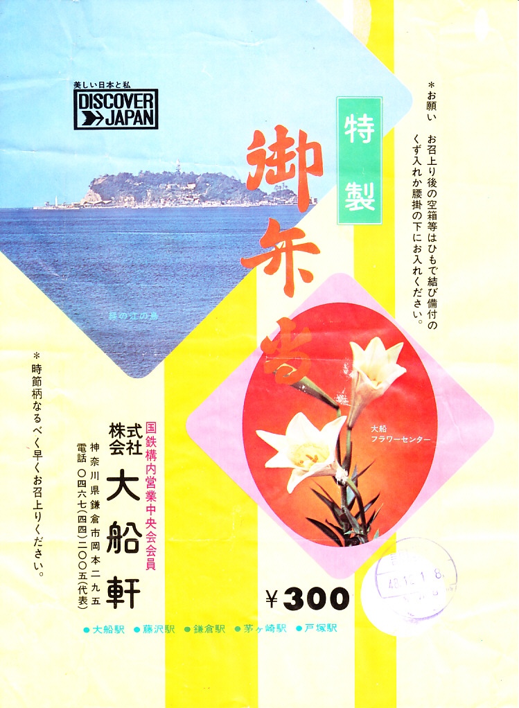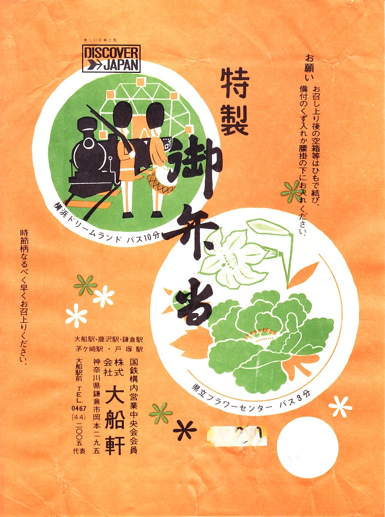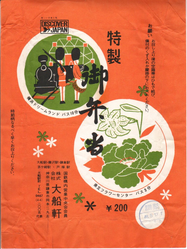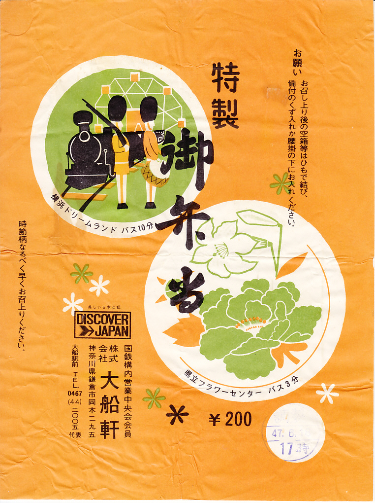 1972(昭和47)年6月18日17時の調製と思われる、昔の大船駅弁の掛紙。駅名の表記と、国鉄の旅行キャンペーン「DISCOVER→JAPAN」のロゴマークの位置を除くと、上記の1973年5月の掛紙「特製御弁当」と、同じ絵柄である。