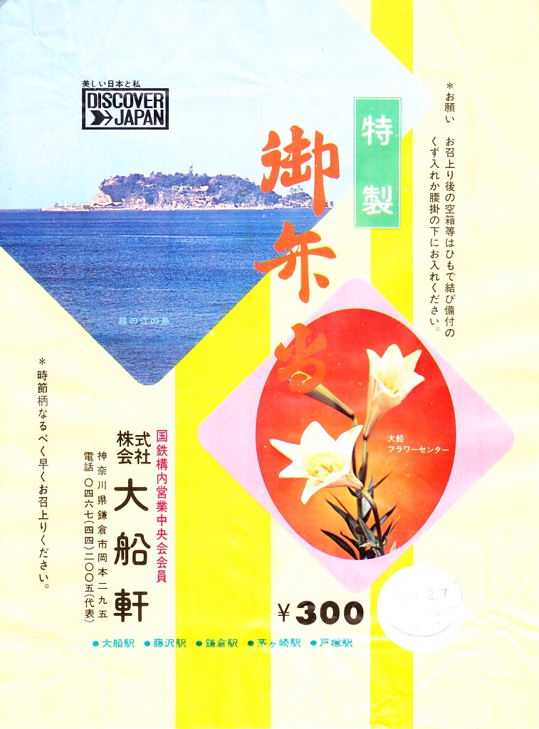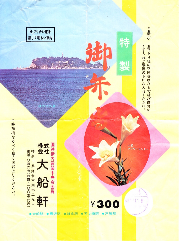 1973(昭和48)年10月20日7時の調製と思われる、昔の大船駅弁の掛紙。「緑の江の島」と「大船フラワーセンター」として、江ノ島とユリの写真を掲載した。同じ日時で3枚もの掛紙を得た。