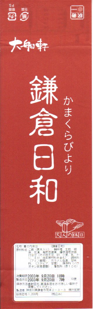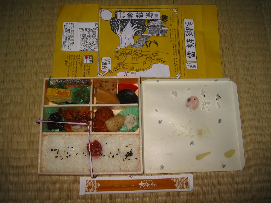 2010(平成22)年10月9日から11日まで東京駅で開催された「第12回東日本縦断駅弁大会」で販売された大船駅弁の復刻商品。といっても復刻したのは掛紙だけであり、中身は普段の大船駅の並等な幕の内駅弁と同じである。掛紙裏面の解説と違い少量な日の丸俵飯に、鶏唐揚とイカ焼とわさび漬、白身魚フライとかき揚げと佃煮、ニンジンとシイタケとタケノコとちくわの煮物、焼鮭と玉子焼とうぐいす豆。掛紙の絵柄は鎌倉八幡宮と2010年3月に倒れた大銀杏。この掛紙が使われた1924(大正13)年当時に比べて、大船や鎌倉の名所はたいして変わっていない。