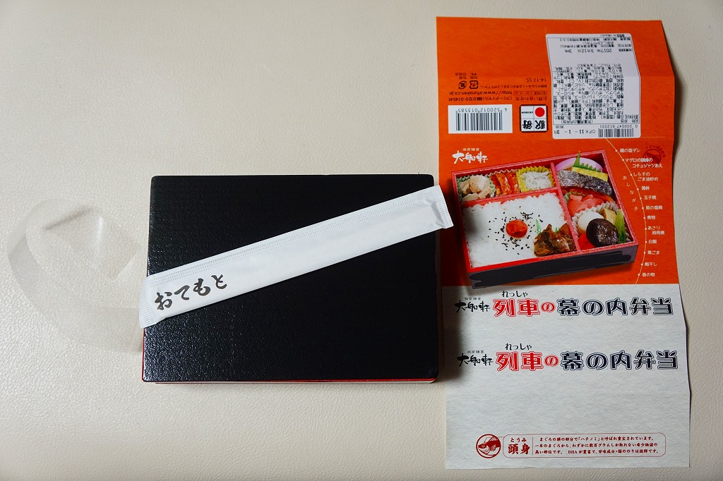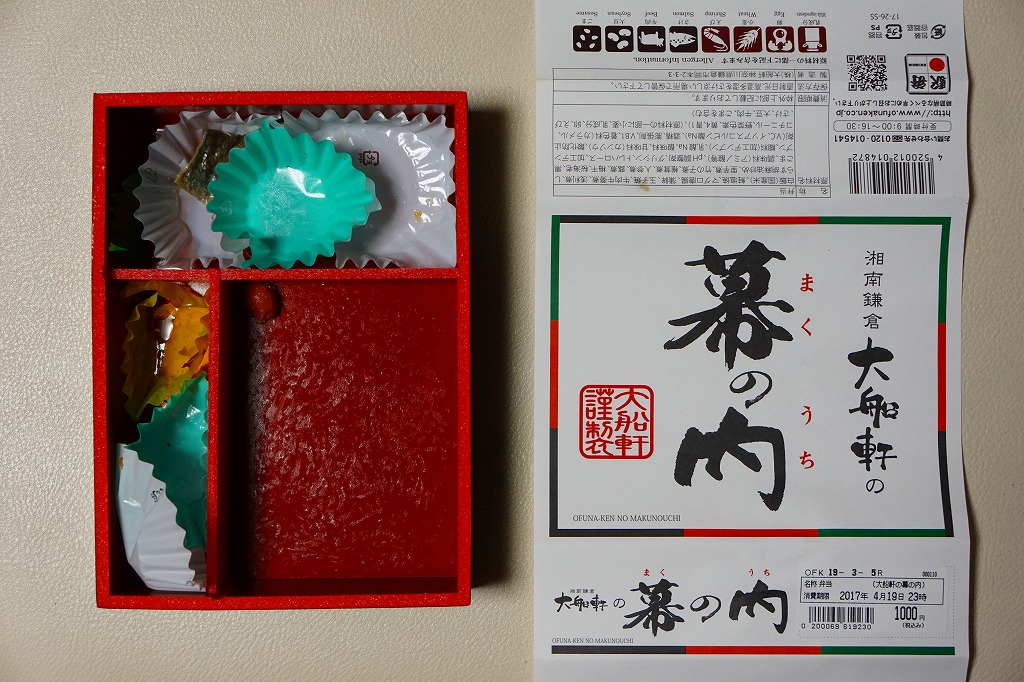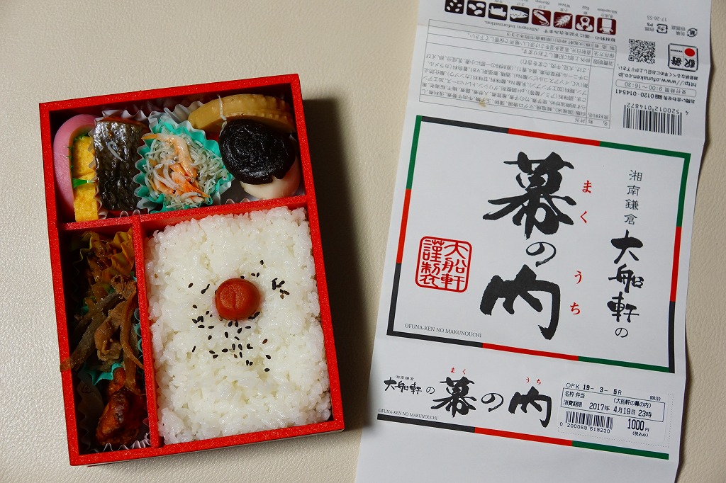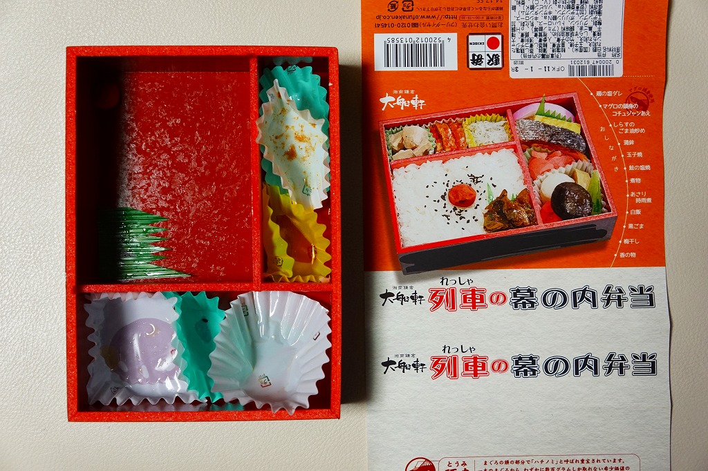 今回購入したものは、レシートに「列車幕の内第2弾」とあったので、過去に第1弾が存在した模様。中身の写真を使う掛紙に、列車の停車駅案内のようにおしながきを記す。中身は日の丸御飯にアサリ時雨煮、焼鮭とかまぼこと玉子焼、蒸し鶏とマグロのコチジャンとシラス炒め、サトイモやシイタケなどの煮物と漬物。大船駅弁や大船軒らしさのない、普通の幕の内駅弁。2016(平成28)年の夏までに、上記の駅弁「湘南鎌倉大船軒の幕の内」へリニューアル。