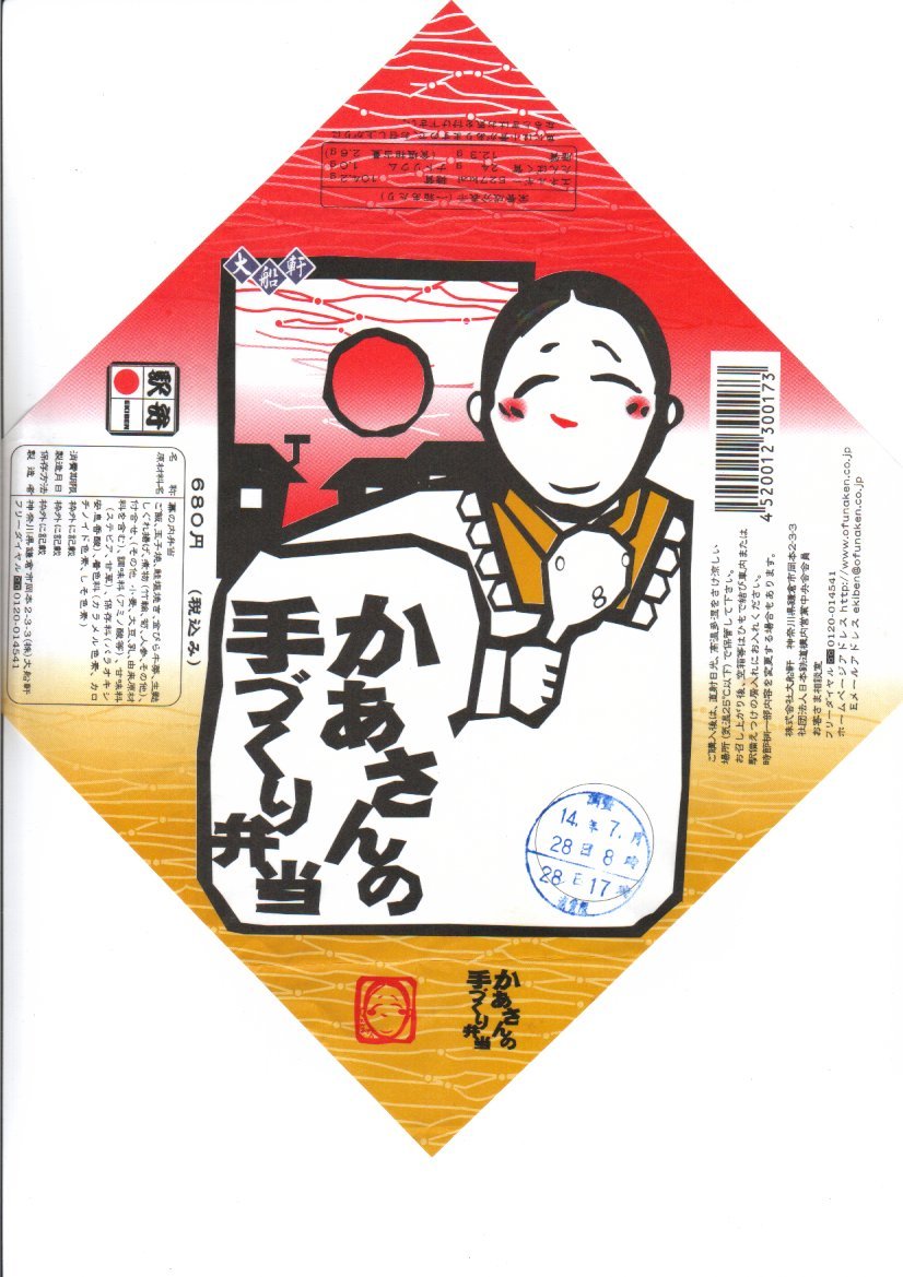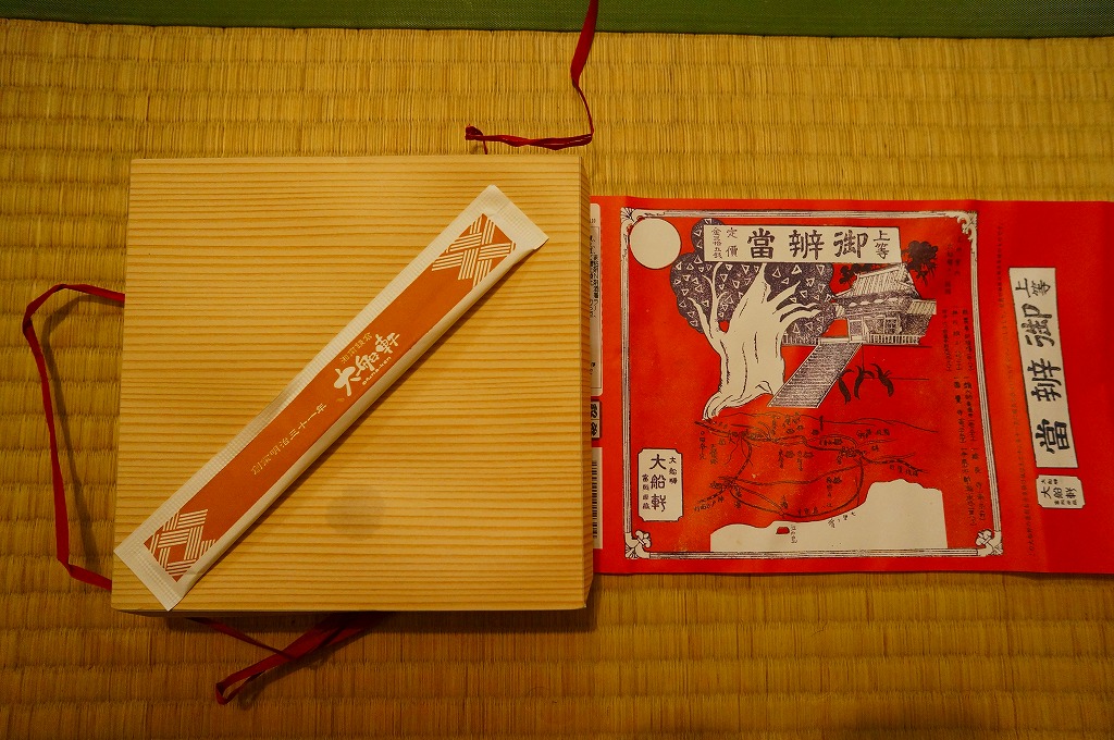 1939(昭和14)年1月8日7時の調製と思われる、昔の大船駅弁の掛紙。その絵柄は下記の1938年2月のものと同じはずが、大船軒の船の漢字が舩になるなど、不思議と文字の形や位置が微妙に異なる。