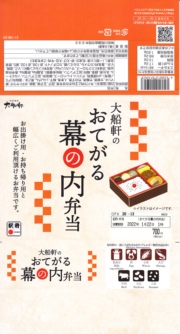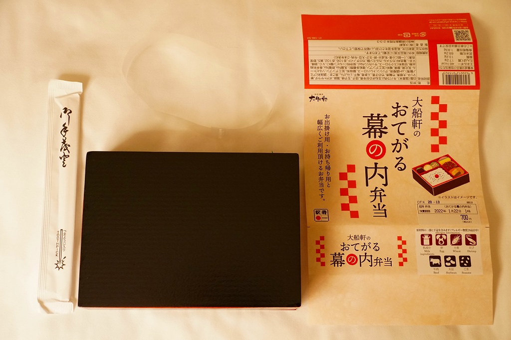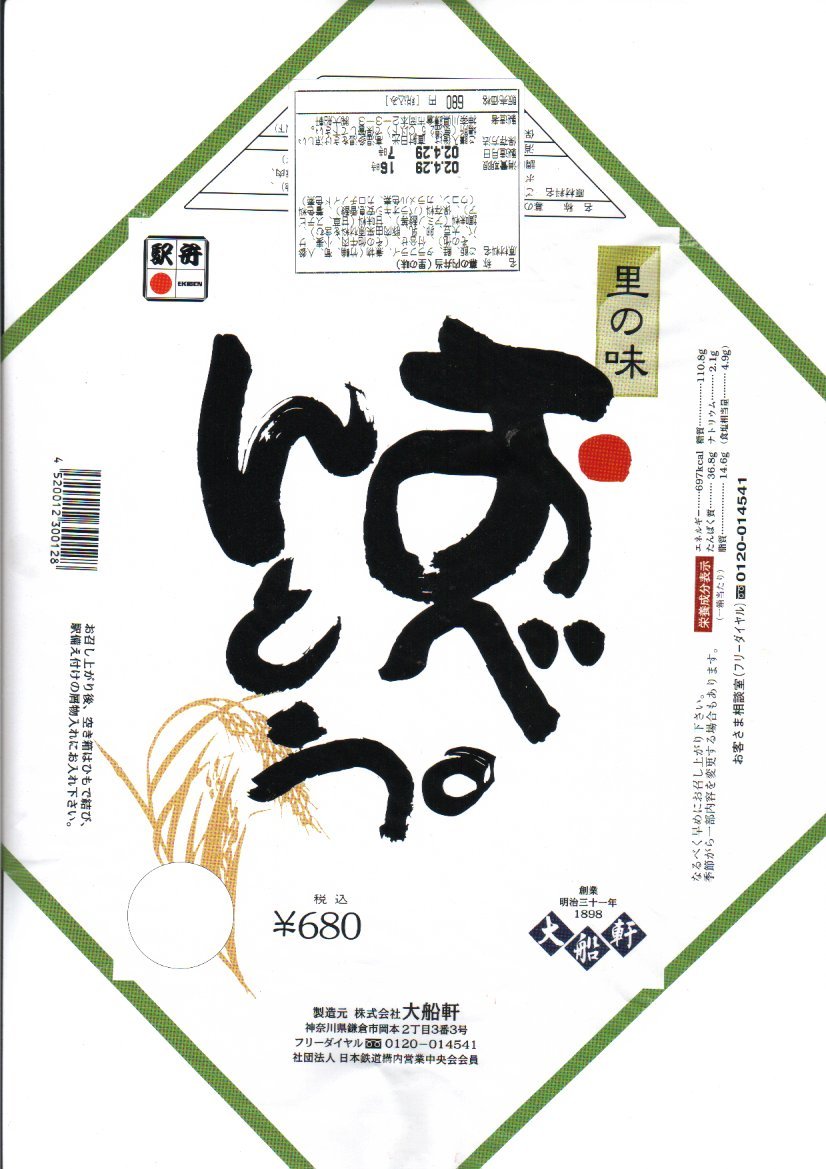 2019(平成元)年1月に発売。おそらく従前の幕の内弁当のリニューアルだろう。大船駅よりはむしろ東京都内の駅弁売店で手広く売られる。幕の内駅弁らしくなく、松花堂タイプの4区画に仕切られた中身は、日の丸御飯、エビフライと鮭塩焼とごぼうそぼろ、肉団子と煮物、紅白のかまぼこと玉子焼にひじき煮と漬物。そんな御飯に三種の神器(焼き魚、かまぼこ、玉子焼)という内容は幕の内駅弁らしい、普段使いの駅弁。過去の大船軒のこのタイプの駅弁よりは、味と盛付に立体感が出たと思う。
