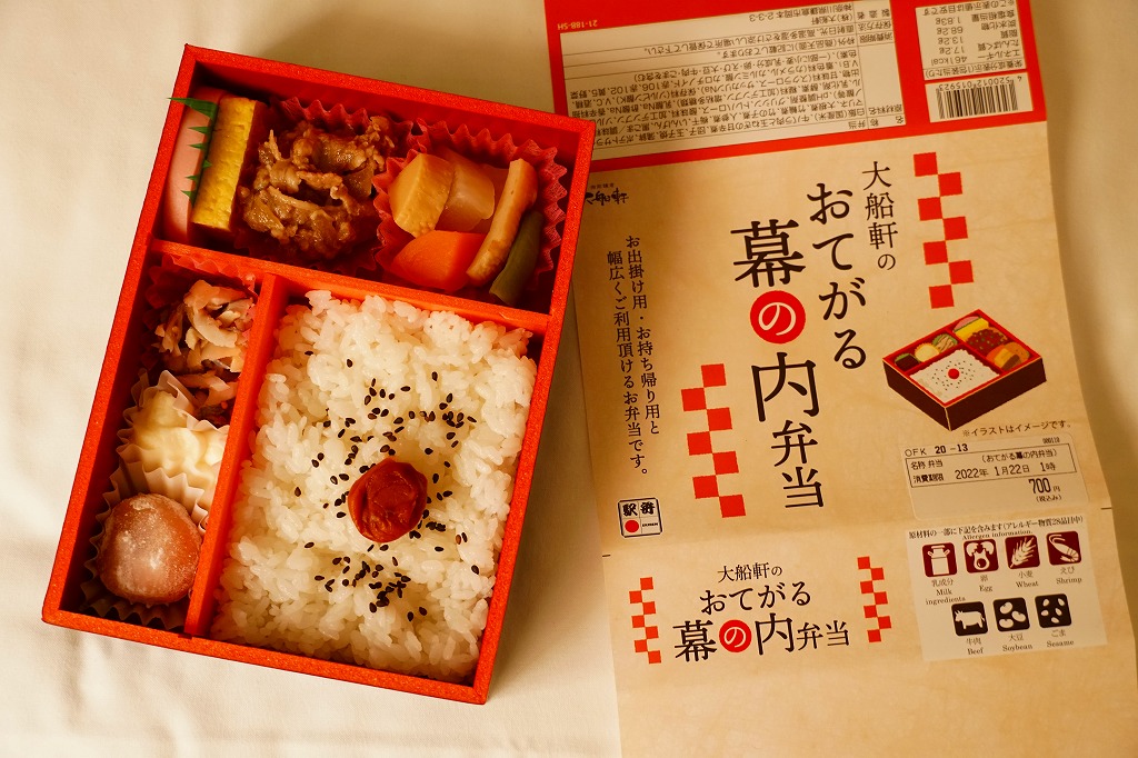2021(令和3)年10月に大船駅などで「牛肉としらす二色盛弁当」とともに発売。梅干しと白飯の日の丸御飯に、牛肉煮にだいこんやタケノコなどの煮物、かまぼこと玉子焼、鯵マリネとポテトサラダとミニ大福を添える姿は、3年から5年くらい前に売られた大船駅の幕の内弁当に似る。普段使いの幕の内弁当の基本を押さえ、価格を抑え、鯵を入れて大船駅や大船軒の駅弁らしさが表れ、漬物を入れず甘味を入れた変化も現れる。JR東日本の方針でこの年の3月に寿司以外の駅弁が全滅した大船駅に、なぜか再びこのような駅弁が戻ってきた。しかし購入後ほどなく終売か。