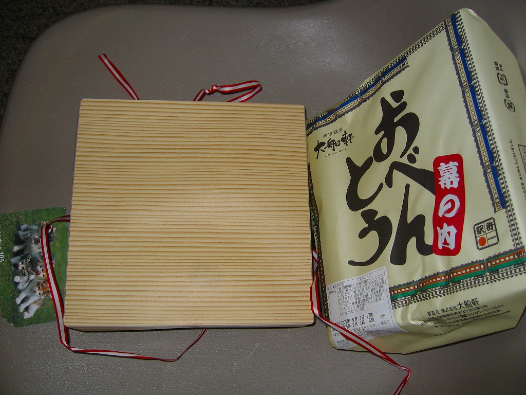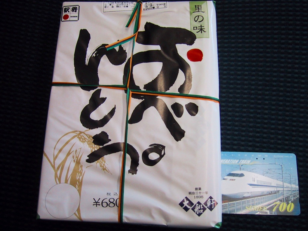 大船駅の普通の幕の内弁当。掛紙をかけて湘南電車の色の紙ひもでしばる長方形の容器の、半分は白御飯、半分はおかずで揚げ焼売・鶏唐揚・白身魚フライ・焼鮭に椎茸等の煮物が入る。御飯は美味く、おかずも身の締まった良い食感。神奈川県、特に大船駅の幕の内弁当は本当に美味い。これを購入した直後の2002年5月に「かあさんの手作り弁当」へリニューアルされた。