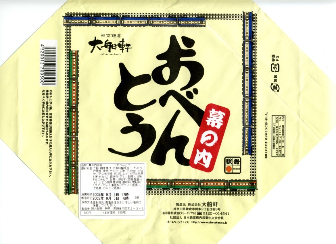 2004(平成16)年の秋頃に、下記の駅弁「特製おべんとう」をリニューアルか。正方形の容器に紙ぶたをして、戦後直後の横須賀線電車を枠に描いた白い掛紙をかけて、紅白の紙ひもで締める。中身は日の丸御飯に鮭塩焼、鶏唐揚、玉子焼、蒲鉾、煮物その他を詰める、いわゆる幕の内駅弁。これも含め最近の大船駅弁は、容器内に無駄な空間が多く容器の底の紙がよく見える、見栄えで損をするものが多いと思う。リニューアル前のほうが良かった感じ。2006年頃までの販売か。