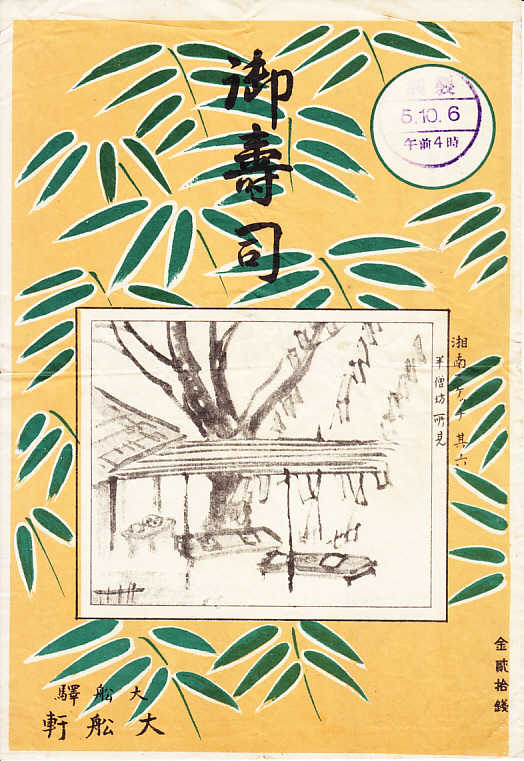 1930(昭和5)年10月6日16時の調製と思われる、昔の大船駅弁の掛紙。「湘南スケッチ其(その)六」とあり、今でいうシリーズものの掛紙だろう。として半僧坊を描いたようだが、建長寺でなく茶屋のようにみえる。舩は船の異体字で、駅名にも屋号にもこれが使われている。