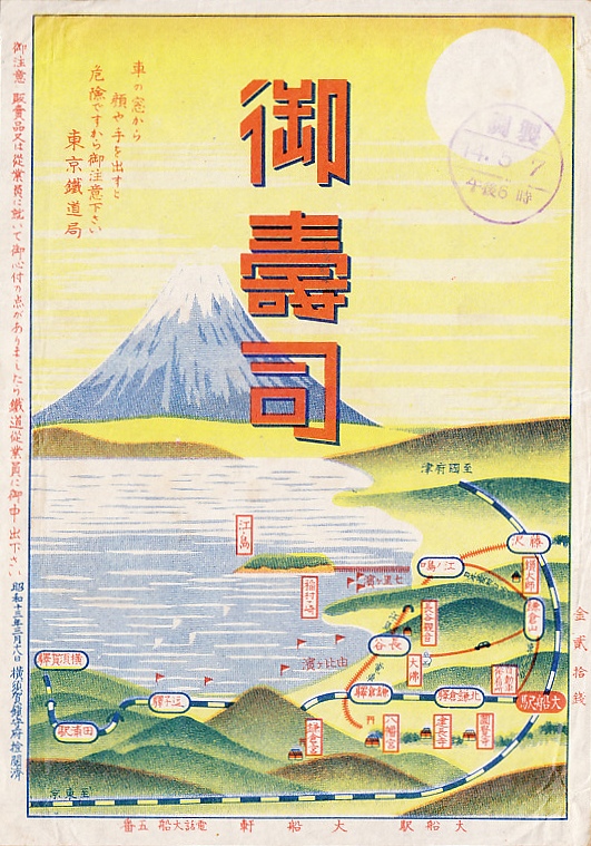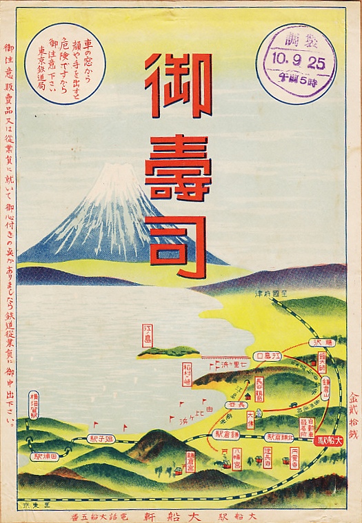 1935(昭和10)年9月25日5時の調製と思われる、昔の大船駅弁の掛紙。富士山を背景に、大船駅から鎌倉や江ノ島などの行楽地への交通案内が描かれる。大船駅と鎌倉山と江ノ島口と大佛を結ぶ実線には「日本最初ノ自動車専用道路」と付記される。江ノ島電車が鎌倉駅でなく八幡宮に向かうのは誤記ではなく、1949(昭和24)年2月までは横須賀線をくぐり若宮大路の路面を走っていた。