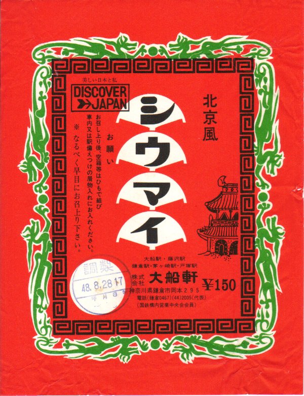 1973(昭和48)年8月28日17時の調製と思われる、昔の大船駅弁の掛紙。昭和時代の末期までの東海道本線では、横浜駅に限らず駅弁販売駅ごとに駅売り焼売が存在し、大船駅でもこのように赤い掛紙のシウマイが存在した。北京風の焼売とはどんなものだろうか。