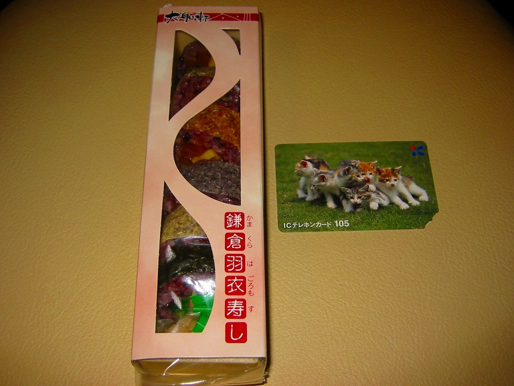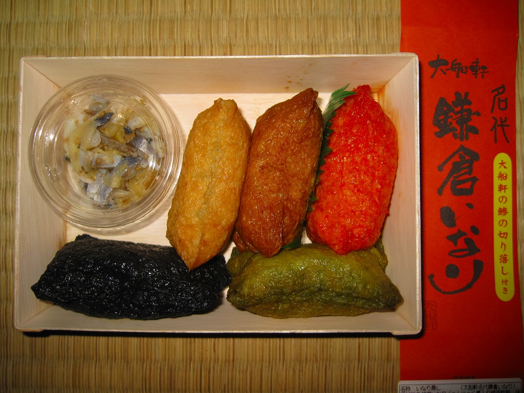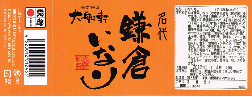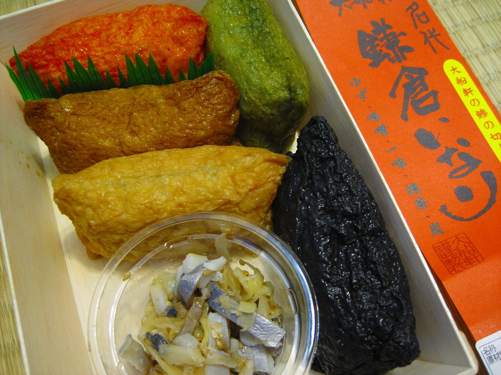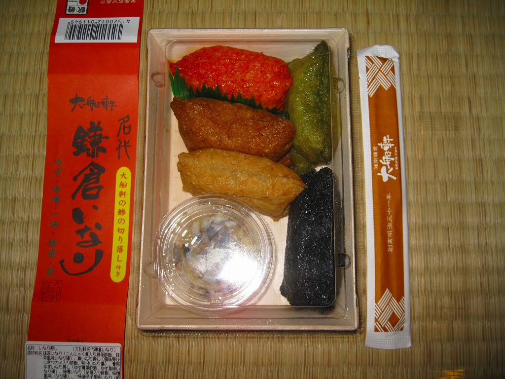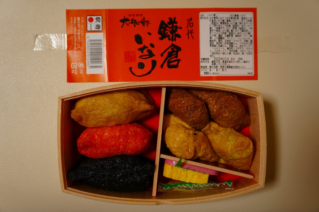下記の駅弁「名代鎌倉いなり」の、2012(平成24)年の秋時点での姿。名前と趣旨は変わらないようだが、容器が惣菜向けから駅弁向けの樽形平面な発泡材製に変わり、掛紙が縦長から横長に変わり、5種のおいなりさんのうちゆず青菜と黒糖の2種の形状が変わっている。味は以前から良く、これで見栄えもさらに良くなった。この年限りの販売か。