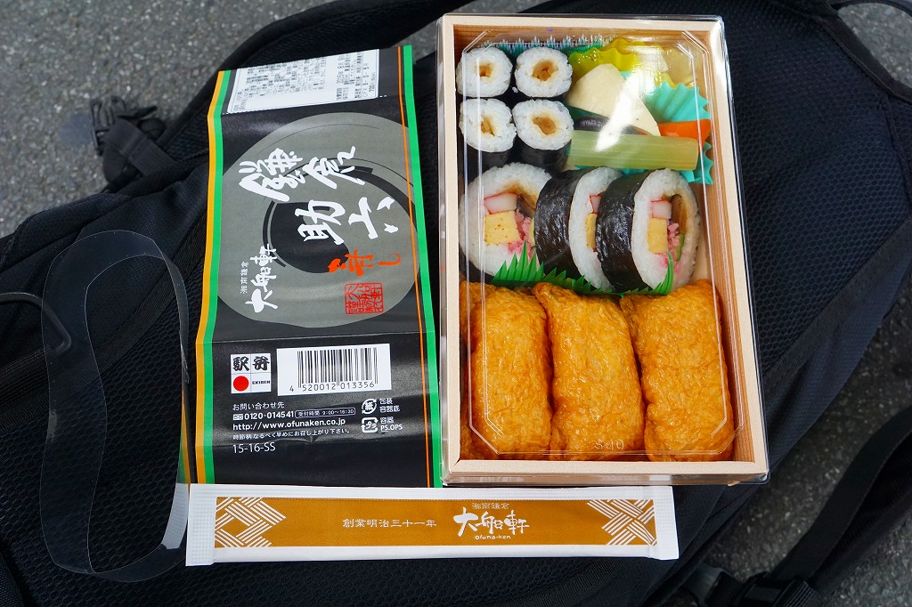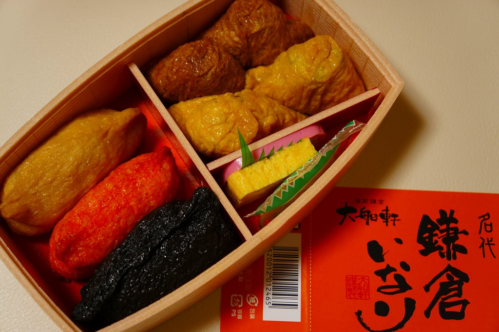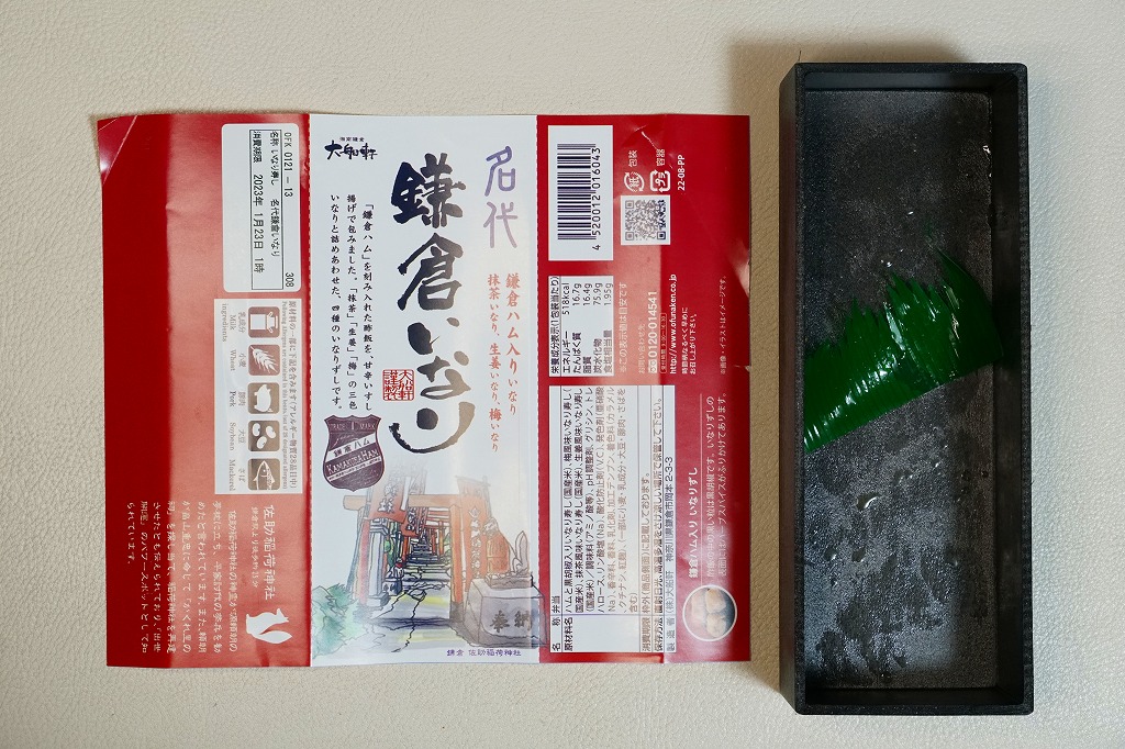 下記の駅弁「名代鎌倉いなり」を、2022(令和4)年10月までにリニューアル。容器は細身になったが、価格と掛紙の絵柄が据え置かれたため、変更に気が付かなかった。中身は引き続きおいなりさんでも、同じ色の3個が小さな5個に変わり、鎌倉ハム入りいなり2個、抹茶いなり、生姜いなり、梅いなりの構成となった。味は引き続き、それぞれほぼ変わらないと思うが、見た目の色が違うので、香りも違う気がしてくる。2023年4月に大船軒がJR東日本クロスステーションに吸収合併され、大船の調製所が廃止されたため、その2023年5月限りで終売。