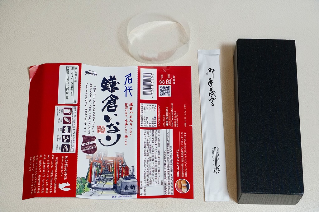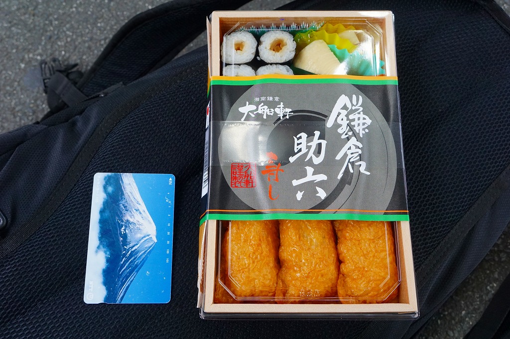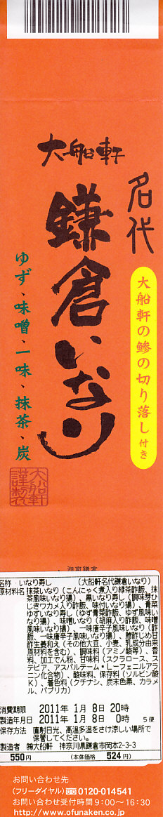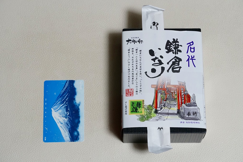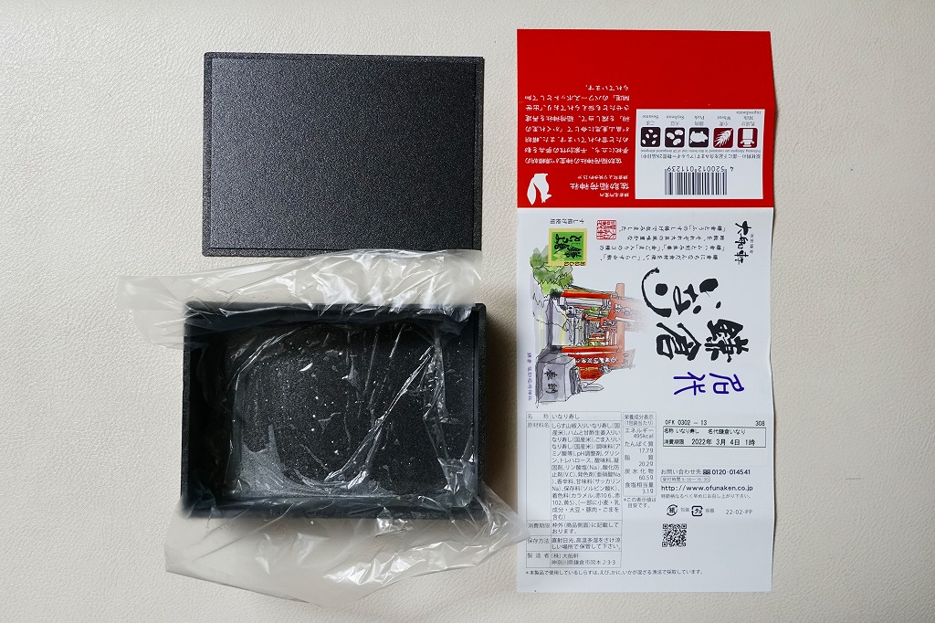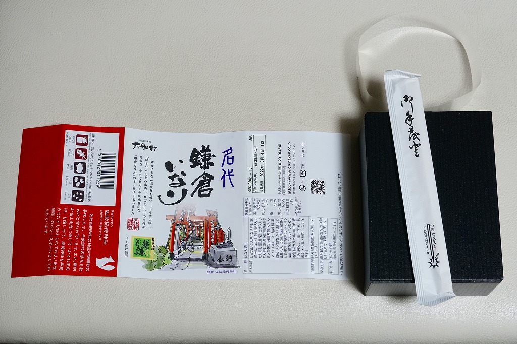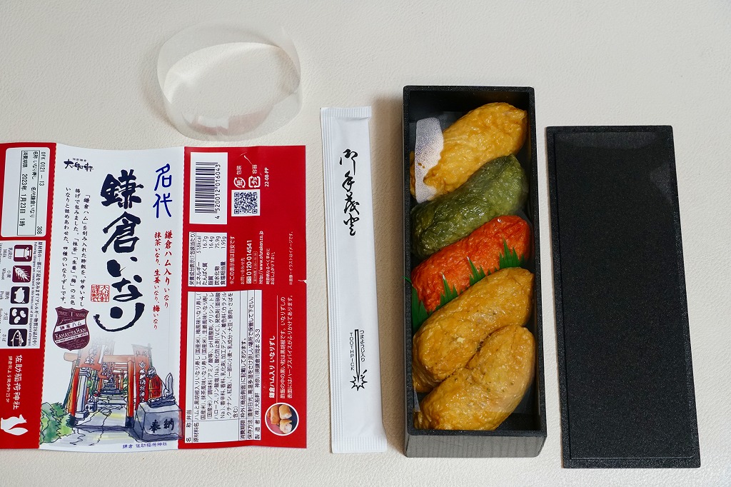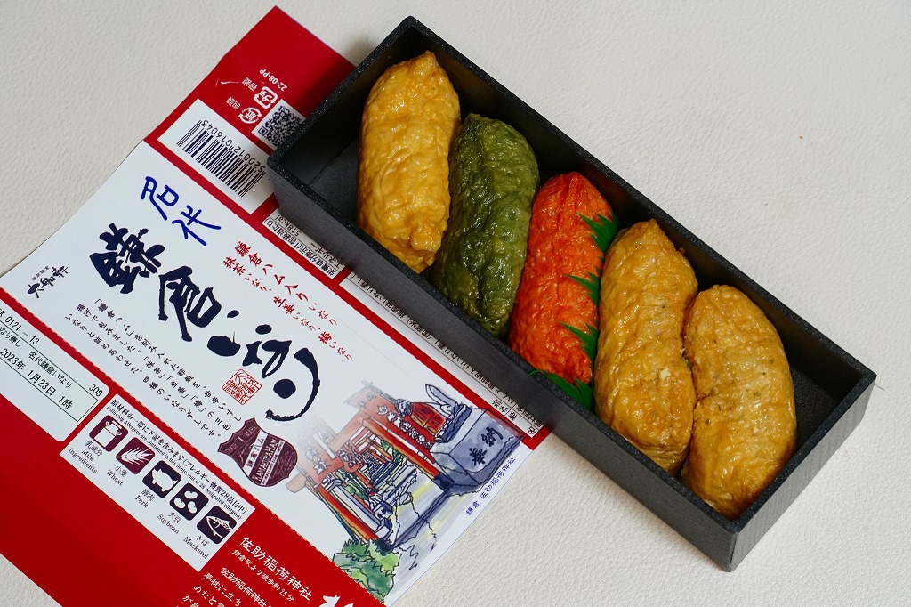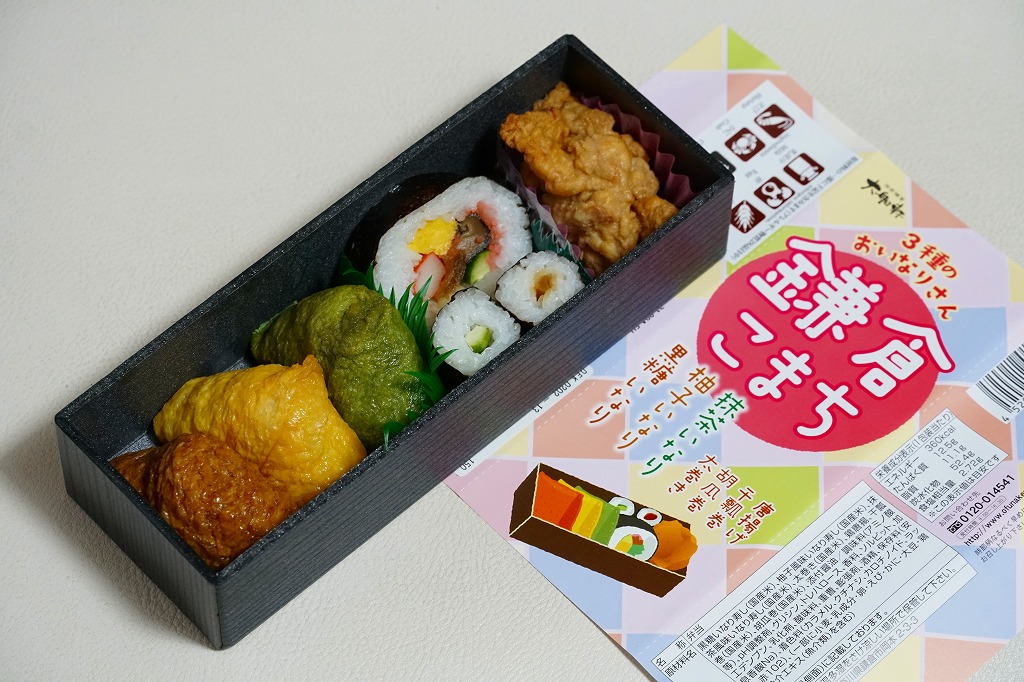 2022(令和4)年の2月までに発売か。黒い小箱に稲荷寿司を3個詰め、商品名に宣伝文や鎌倉佐助稲荷神社を描いた掛紙を巻く。おいなりさん3個の中身はすべて異なり、しらす山椒入り、ハムと甘酢生姜入り、ごま入りとなるが、食べても分からないくらい、同じ味をしていた。口当たりは柔らかく、味付けはしっかり。大船駅弁の稲荷寿司は、下記のとおり過去十数年間ほど様々な姿を模索しており、ここにきて2000年代の姿に戻ったようだ。2022年10月までに上記の「名代鎌倉いなり」へリニューアル。