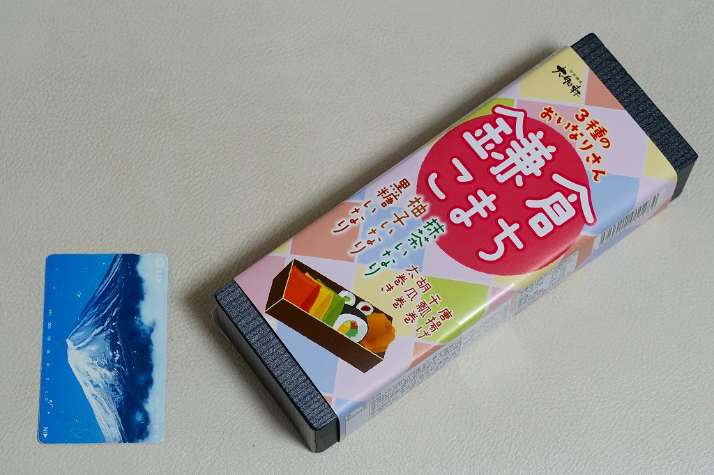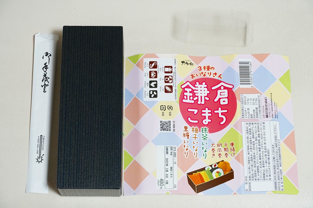 2021(令和3)年7月から8月まで販売された記念駅弁「E235(鎌倉こまち)」(500円)が、9月に掛紙を替えて20円値下げして売り続けられたものと思われる。中身は掛紙にイラストと文字で紹介されるとおり、黒糖いなり、柚子いなり、抹茶いなりでお揚げが3色の三角いなり、太巻き1切れ、胡瓜(きゅうり)巻の干瓢(かんぴょう)巻の細巻き各1本、鶏の唐揚げ2個。値段も分量も風味も軽く、買いやすく食べやすい。2022年6月頃までの販売か。