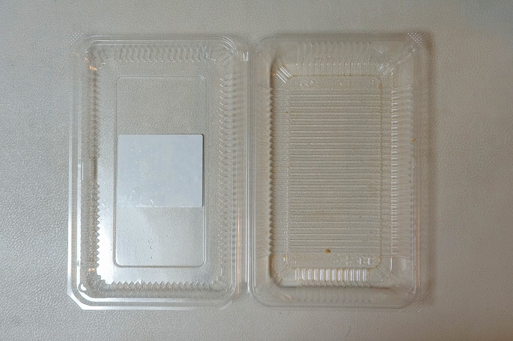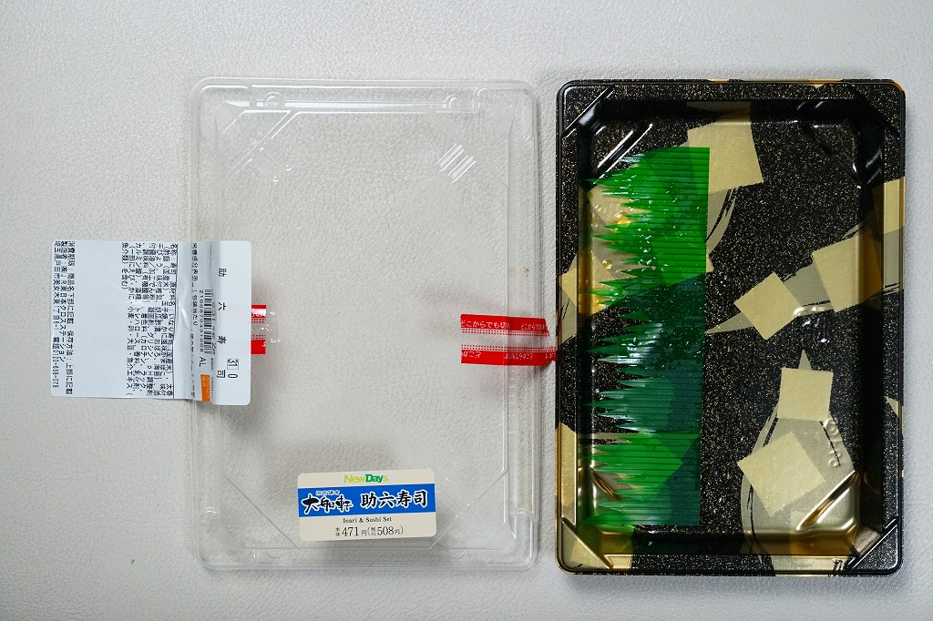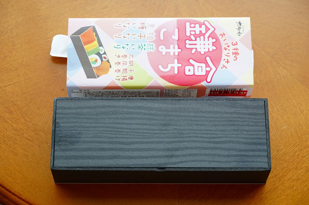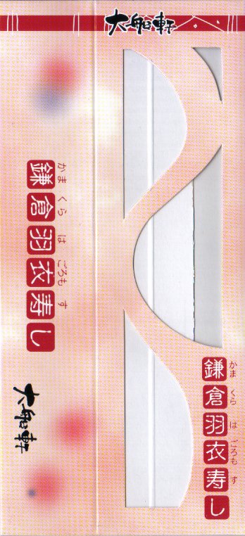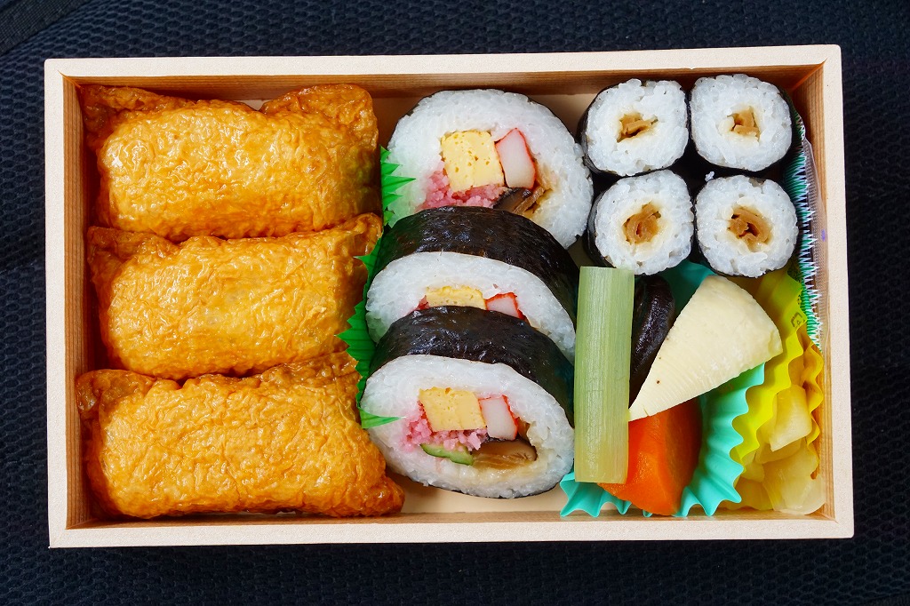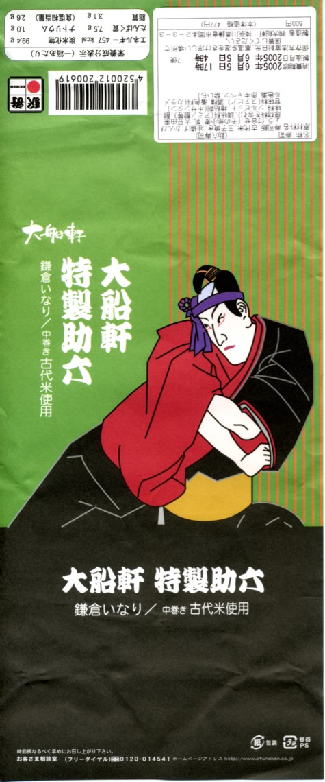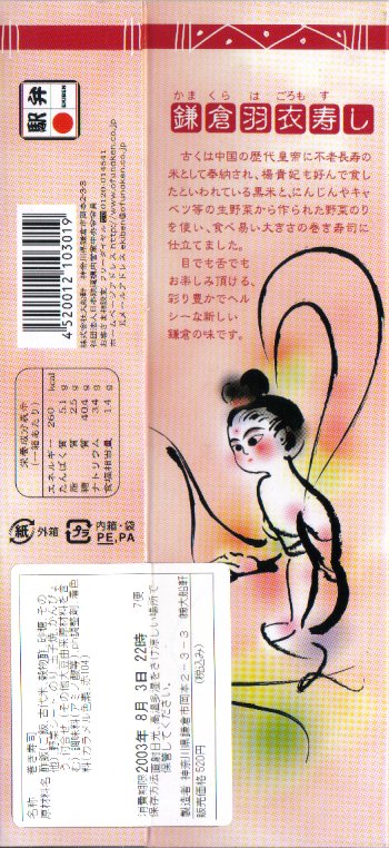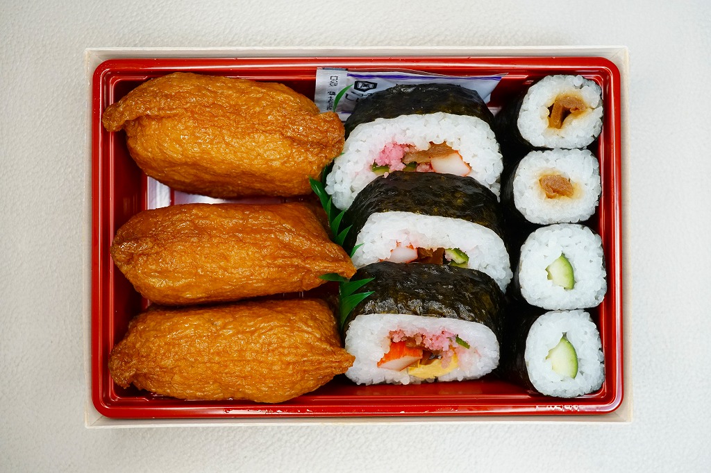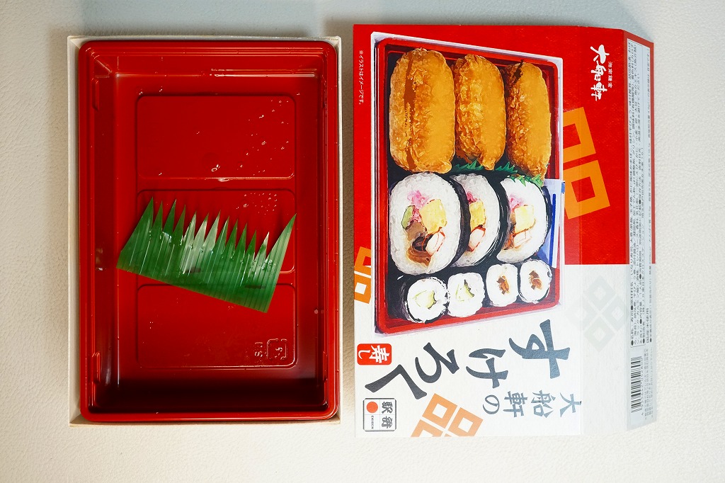 2005(平成17)年頃に発売か。スーパーでおなじみのプラ製の惣菜容器に、割りばしごと掛紙を巻いて、セロハンテープで留める。中身は鎌倉いなり2個、梅細巻2個、かんぴょう細巻2個、古代米中巻2個。