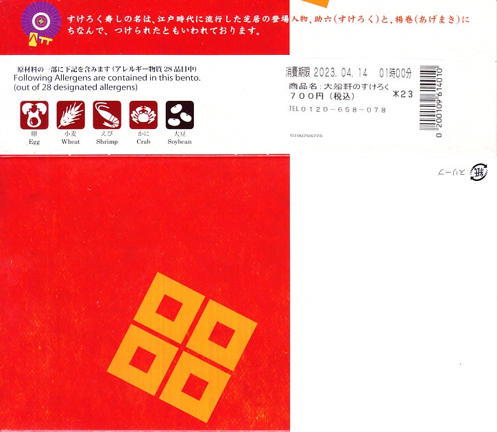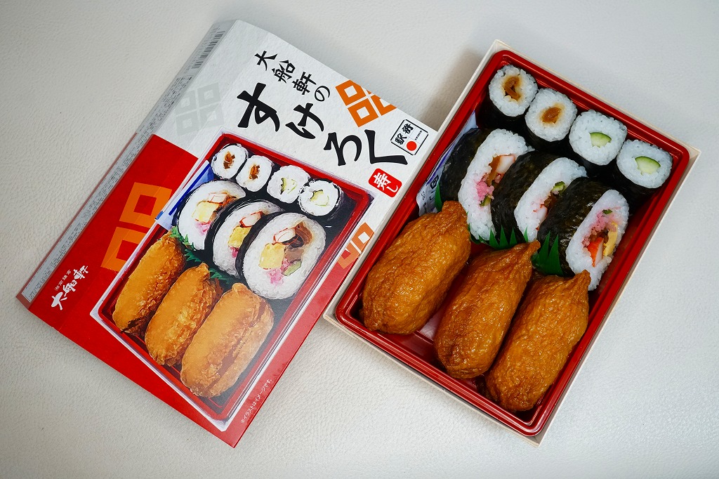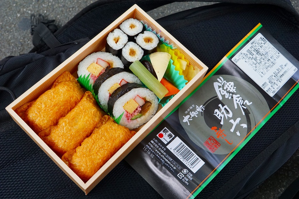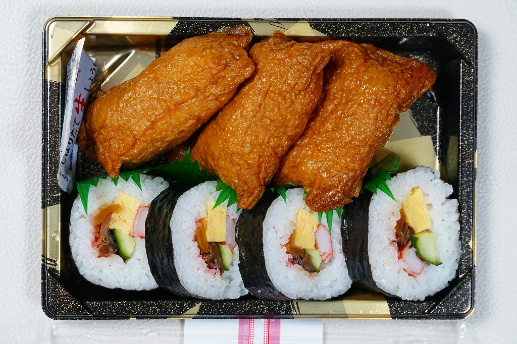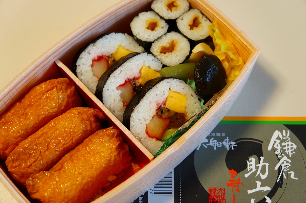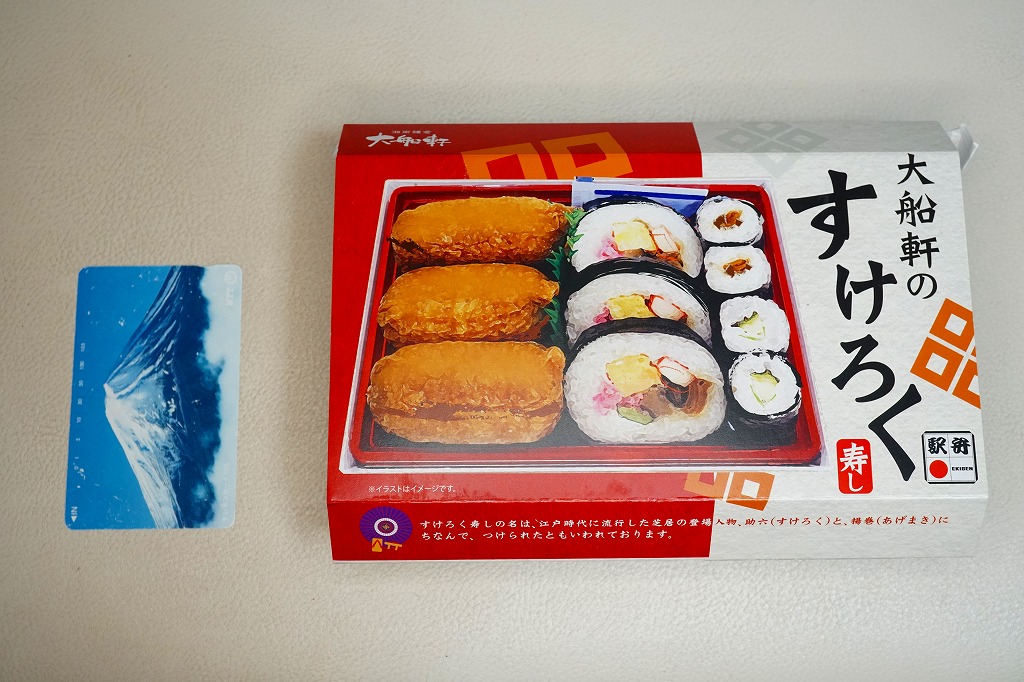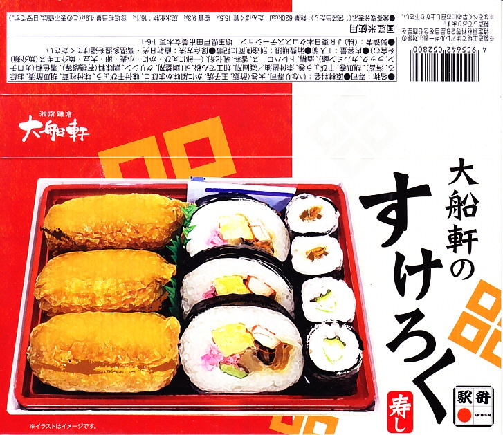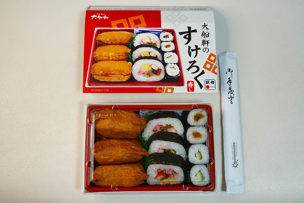 2016(平成28)年に500円で発売。「大船軒のすけろく」というから大船駅の駅弁に見えるが、実態は東京駅など首都圏の駅弁屋で売られる商品で、親会社の日本レストランエンタプライズ(NRE)の駅弁群の一翼を担うもの。スリーブの写真のようなイラストのとおり、中身はいなりずし3個、太巻き3切れ、きゅうりとかんぴょうの細巻きが各2本という、文字通りの助六寿司。昭和時代に「普通」の駅弁と定義された定番の内容も、この内容で現存する令和の駅弁はほとんどない、実は貴重な存在。価格は2019年時点で600円、2023年時点で700円、2025年2月から750円。大船軒は2023年4月にJR東日本クロスステーションへ吸収され、調製所も埼玉県戸田市へ集約された。