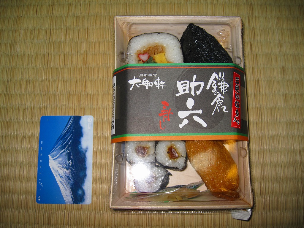 下記の駅弁「鎌倉助六寿し」の、2012(平成24)年の秋時点での姿。名前と趣旨は変わらないようだが、容器が惣菜向けから駅弁向けの樽形平面な発泡材製に変わり、中身は太巻きが2個から3個に、細巻きが3個から4個に増えた一方で、3個のおいなりさんが三色から1種類に変わり、値段が100円も上がった。価格は購入時で680円、2015年時点で700円。