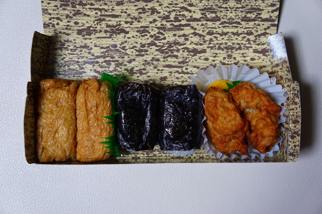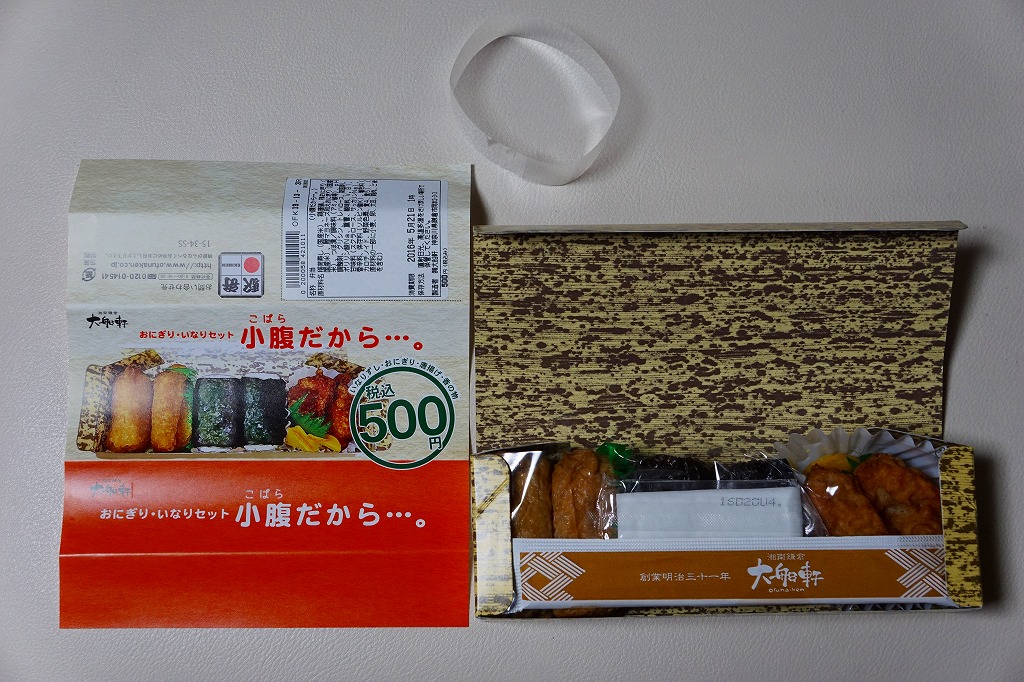 中身は掛紙の写真かイラストのとおり、小柄なおいなりさん2個、細巻風のウメとアジのおにぎり各1個、鶏唐揚2個、つぼ漬。小腹よりやや多めな、米飯の軽食。価格は2015年の発売時で500円、2020年時点で600円。2020年までの販売か。