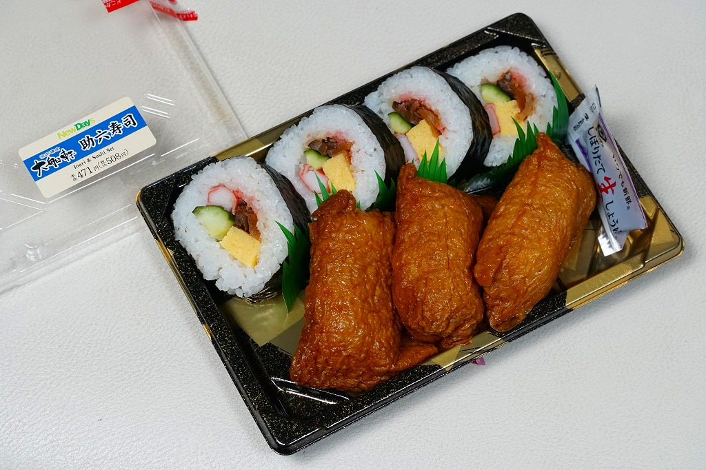 2025(令和7)年1月までに発売。商品に貼ったシールに「大船軒助六寿司」とあるが大船駅の駅弁ではなく、JR東日本の駅のコンビニ「ニューデイズ」で売られるコンビニ弁当であり、そのロゴマークもシールにある。コンビニ向けプラ容器に、いなりずし3個と太巻き寿司4切れと、醤油の袋を詰めた。つまり中身は上記の駅弁「大船軒のすけろく」から細巻きを除いたものであり、いなりずしと太巻きの味と中身はまったく同じ。調製元も調製所も同じなので、おそらく製造ラインも同じなのだろう。日本食堂の流れを汲む駅弁売店と、鉄道弘済会の流れを汲むコンビニで、体裁を使い分けている。価格は2025年の発売時で税込み498円、8月の購入時で508円。
