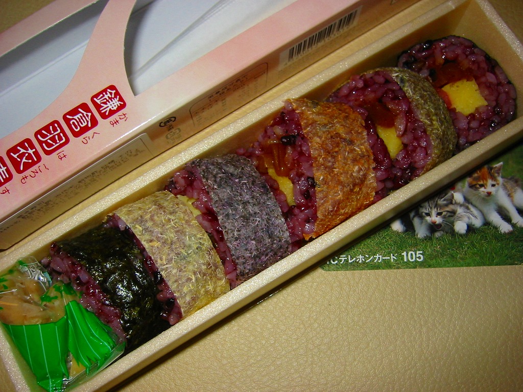 2002(平成14)年8月1日に発売。小柄な長方形の容器に、おかか・ふりかけ・梅の3種の俵飯、というより角が立った直方体飯を2個ずつ詰めて、あとは玉子焼と揚げ焼売と、おあげのようなものがひとつ入る。少量すぎるのはともかく、おかずの部分がスカスカで底が見えるのは見栄えが悪い。2005年6月現在で販売終了済み。