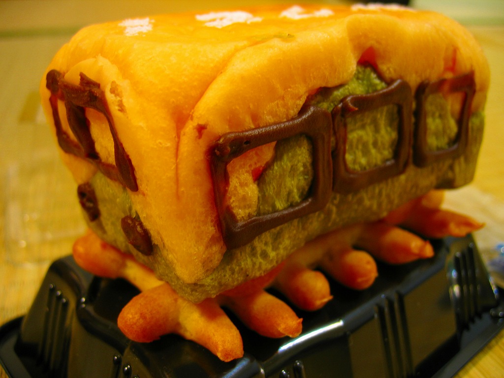 鉄道の軌道を模したはしご型のパンと、電車を模した四角いパンのセット。これをプラ製ケースに1組入れて、駅名標と中身写真と商品名を書いたシールを貼る。パンの色は電車の湘南色、橙色と緑色の塗り分けを記事の色で表現し、チョコレートで窓やライトを描き、パウダーで天井に120周年を描くという凝ったもの。甘さはほどほど。ただ、今回購入品は見本写真と違い、塗り分けがうまく出ていなかった。
