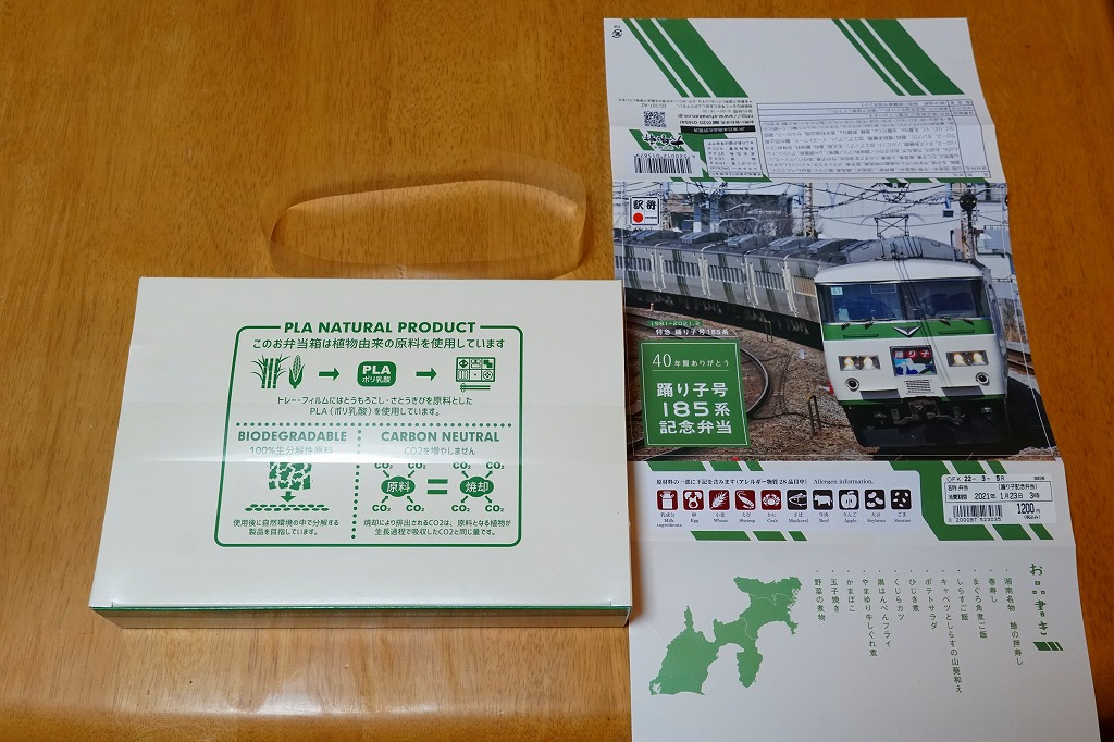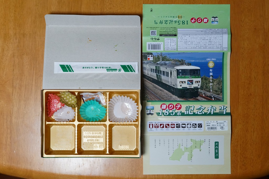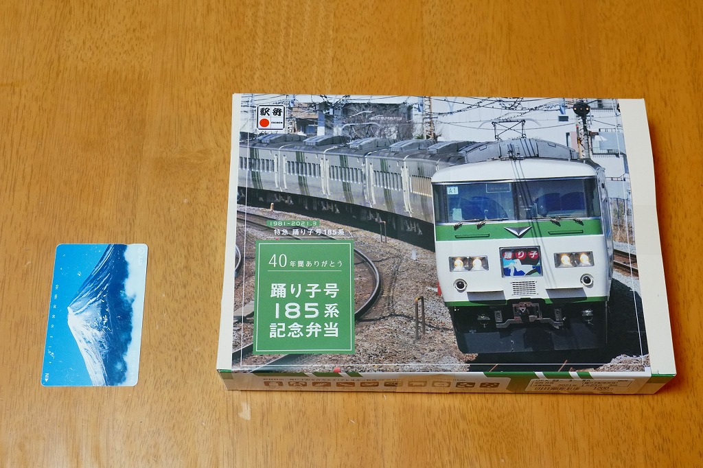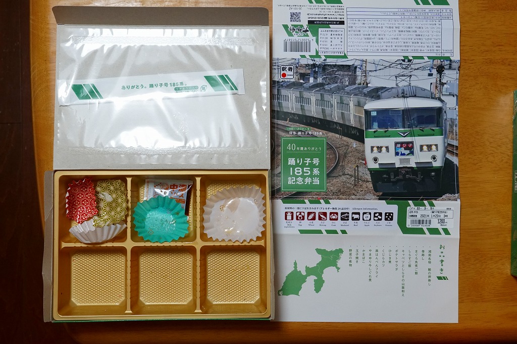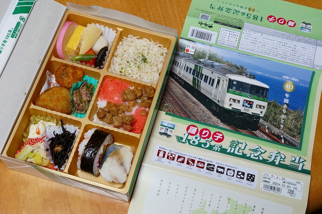 2021(令和3)年1月15日に東京、品川、新宿、上野、大船、藤沢、小田原、熱海の各駅で発売。2月25日に掛紙を替え、3月末まで販売する予定。この年の3月のダイヤ改正で、東京駅と伊豆を結ぶ特急「踊り子」から185系電車が引退することを記念した駅弁。掛紙の写真はもちろん、185系電車の特急踊り子号。加えて紙箱も箸袋も、その特徴である白地に緑のストライプの車体色をイメージしたものが、新たに起こされた。