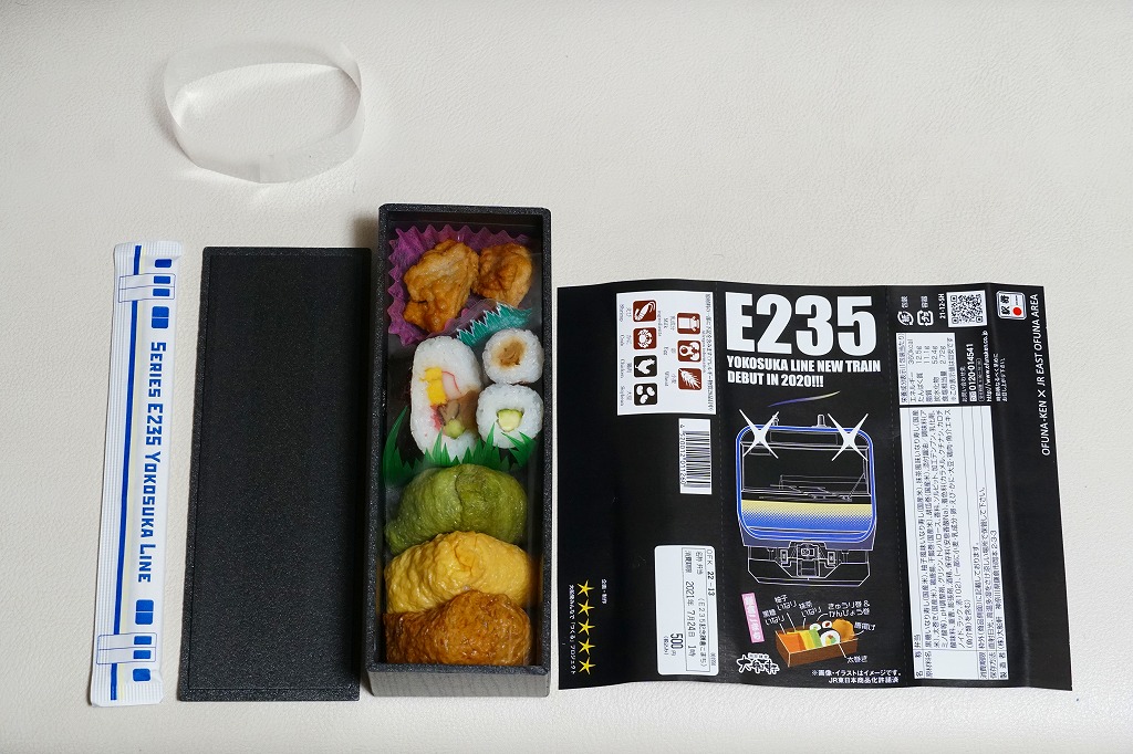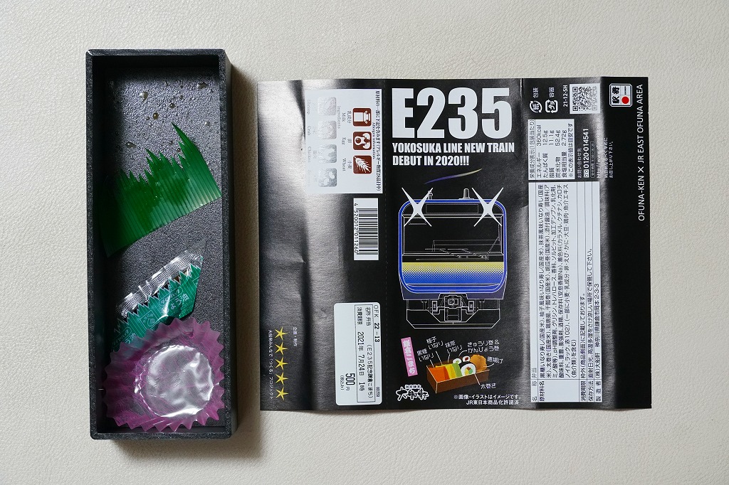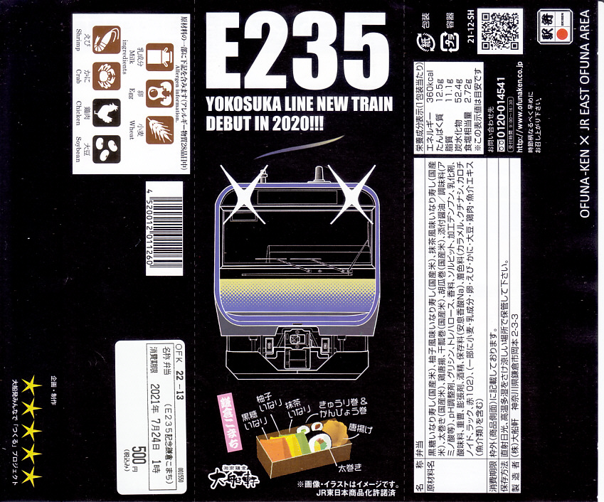 JR横須賀線のE235系電車の記念商品として、2021(令和3)年7月22日から8月31日までの金土日曜に販売。大船駅ではそう掲示したが、公式サイトにはなぜか「7月31日から8月31日の期間限定」と、発売日を変えて掲載した。黒い掛紙には電車の形式と前面のデザインと、駅弁の中身のイラストを描き、裏面には横須賀線のクイズを4問記す。