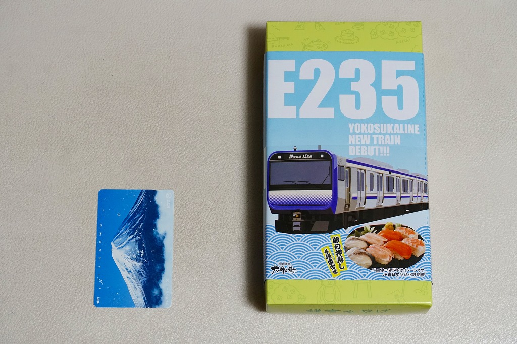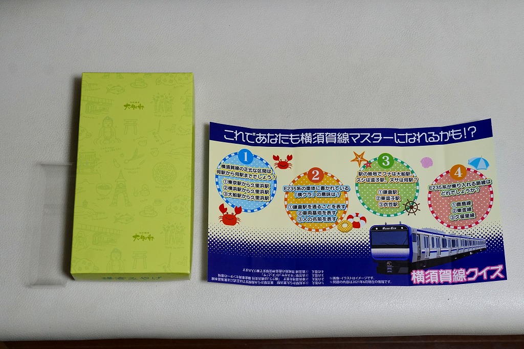 JR横須賀線のE235系電車の記念商品として、2021(令和3)年7月22日から8月31日までの金土日曜に販売。大船駅ではそう掲示したが、公式サイトにはなぜか「7月31日から8月31日の期間限定」と、発売日を変えて掲載した。