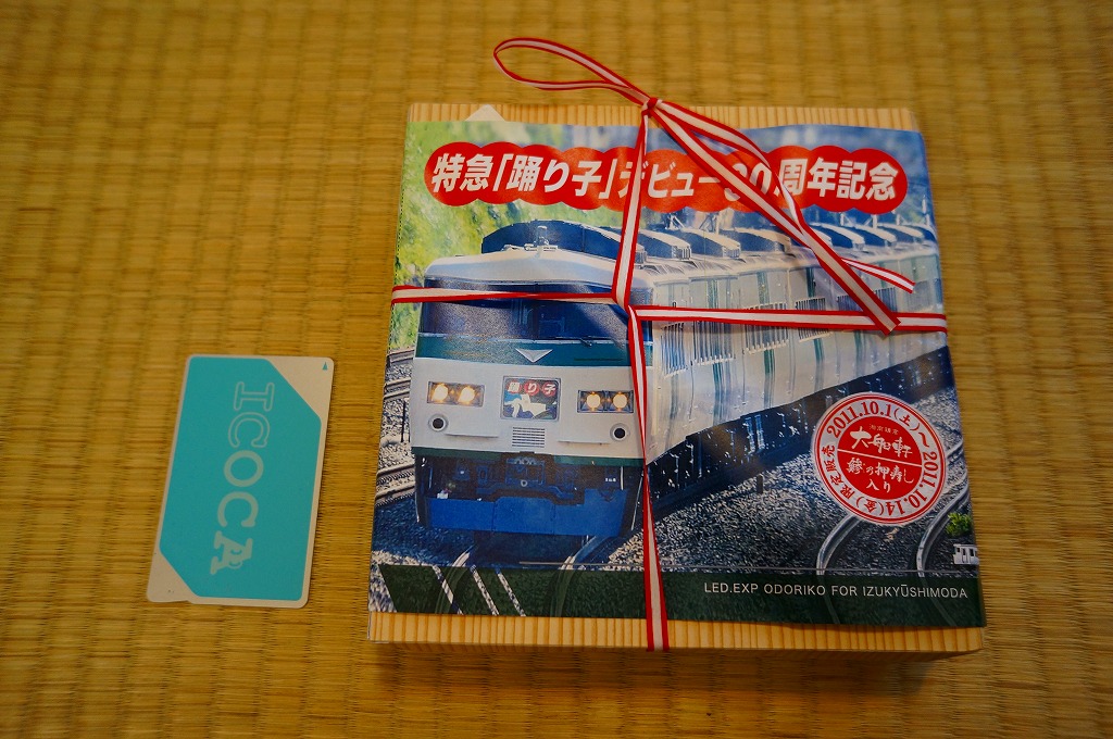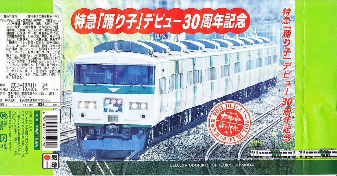 掛紙記載事項のとおり、特急「踊り子」デビュー30周年を記念し、2011年10月1日から31日まで販売された記念駅弁。大船駅に限らず東京駅から熱海駅まで、大船軒や東華軒を名乗る箇所を含むNREの駅弁売店で販売された模様。普段の大船駅弁でも使われる浅い正方形の容器を、踊り子号の走行写真を使う販売期間前半の10月1日から14日までのバージョンである掛紙で巻く。