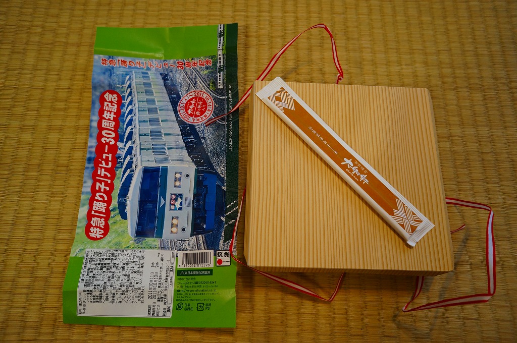これは掛紙に記されるとおり、大船駅の駅そばメニュー「親子そば」を弁当にしたもの。通勤電車も都会の駅の駅そばも、常連客に多く提供されるものであるから、この組合せはとても的を射ている。味もB級グルメとしておいしい仕上がりなので、普段も売られていいと思う。
