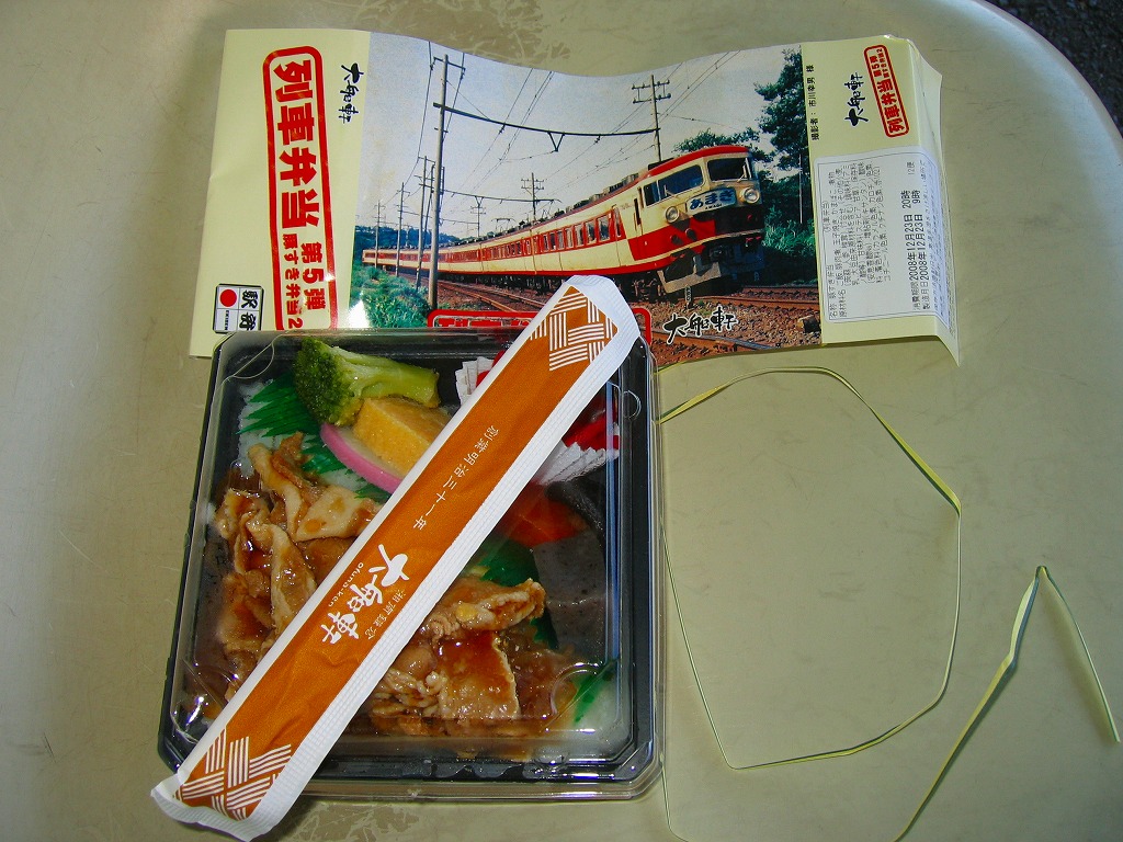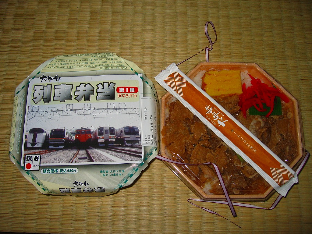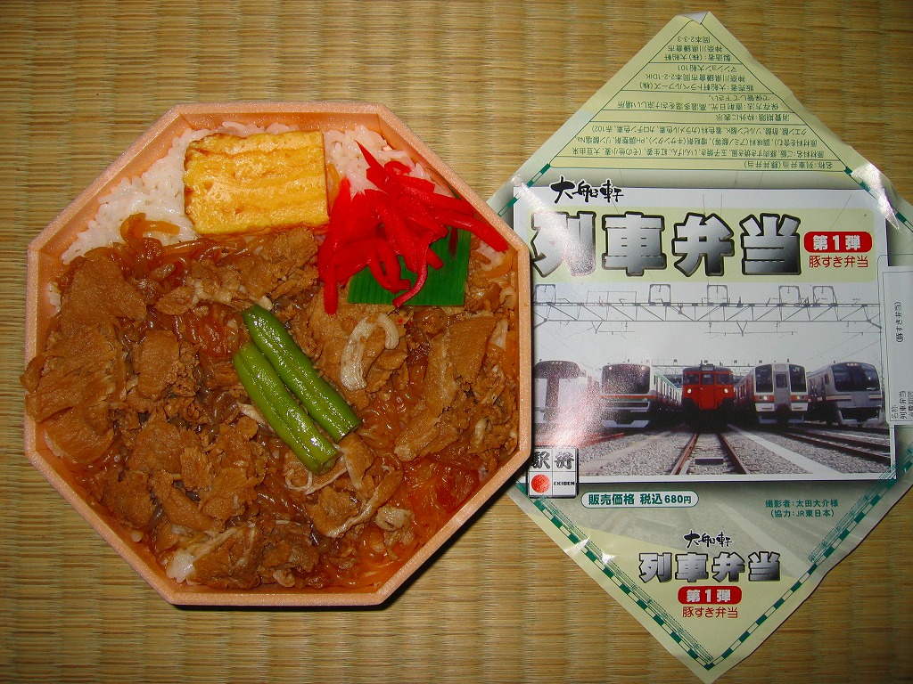 2008(平成20)年8月1日に、金土日曜限定駅弁として発売。正八角形の薄いプラ製容器に透明なふたをかけて、左から215系・E231系・113系・211系・E217系と大船ゆかりの通勤電車が並んだ写真を掲載する掛紙で包む。中身は白御飯の上に豚肉としらたきを敷き詰めて、玉子焼とインゲンと紅生姜を載せるもの。風味はコンビニかファストフードの豚丼そのもので、バリバリのB級グルメ。分量は少なめだが、鉄道ファンの中高生向けにピッタリな駅弁だと思う。この「第1弾」は8月限りで終売。