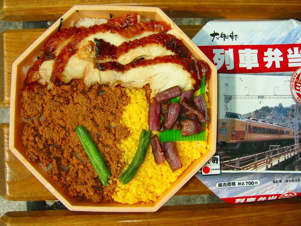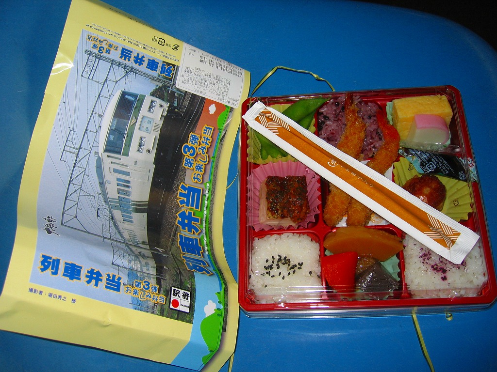 2001(平成13)年4月10日の駅弁の日に発売。長方形の容器を3分割し、左右に御飯を配置、中央におかずとして、ポーク焼売や薩摩芋に、薩摩揚やかき揚げや煮物類を入れるという、横浜駅弁「季節おこわ」にそっくりのつくり。当初は駅弁の日限定の駅弁として製作し、好評のため半年ほど駅売りが続けられていたらしい。現在は入手できない。