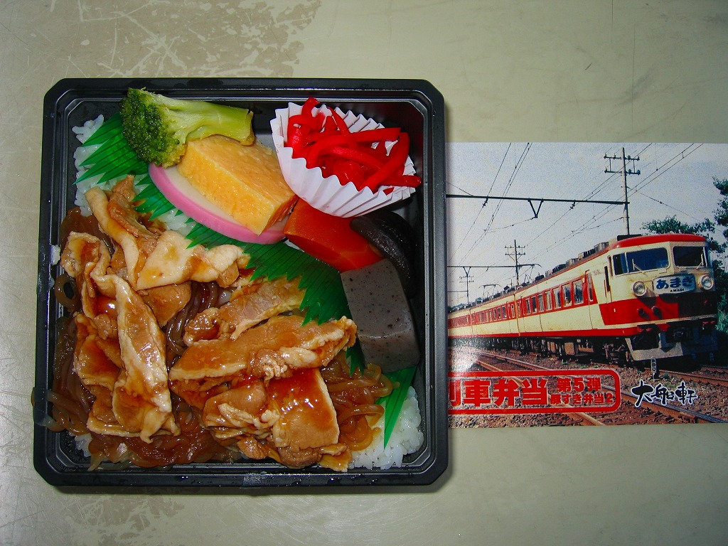 おそらく2008(平成20)年12月5日に、金土日曜限定駅弁として発売。ベースが黒でふたが透明な正方形の、駅弁用とは思えないプラ製の惣菜容器を使用、これに157系電車の特急「あまぎ」の写真を使った掛紙を巻いて、ひもで十字にしばる。中身は白御飯の上に糸こんにゃくと豚肉煮を載せた豚丼で、かまぼこ、玉子焼、ブロッコリー、ニンジンとシイタケとコンニャクの煮物、紅生姜を添える。