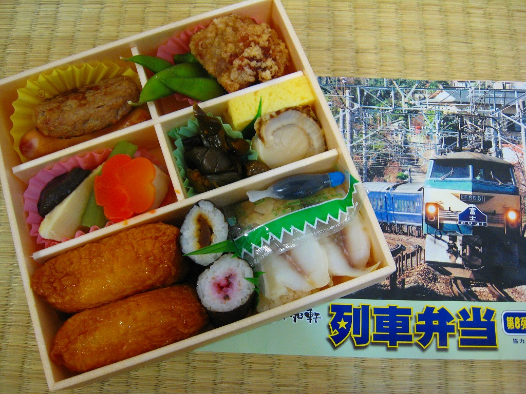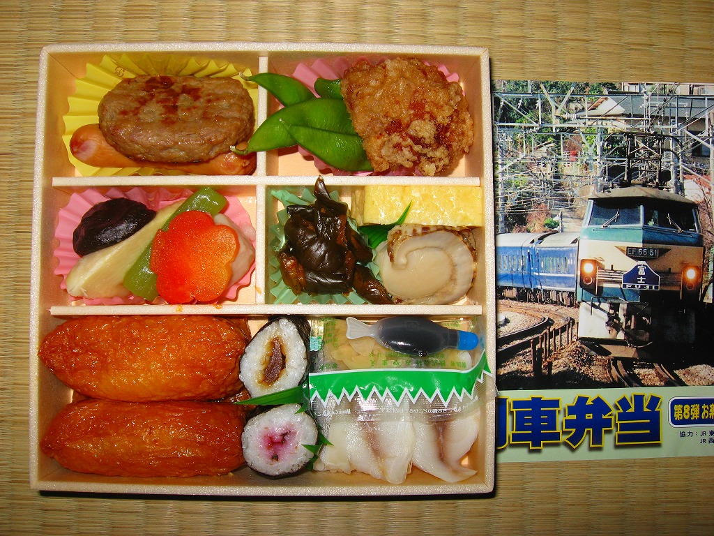 第6弾が1月で「お楽しみ弁当3」なEF5861牽引「踊り子」で800円、第7弾が2月で「お楽しみ弁当4」なEF66牽引「はやぶさ」で880円、そしてこの第8弾が3月で「お楽しみ弁当5」なEF66牽引「富士」で980円と続いた、大船軒の月替わり企画駅弁。なお、この企画はこの第8弾で終了した模様。