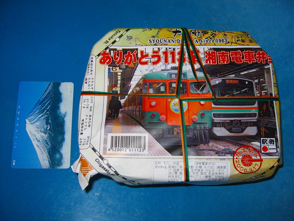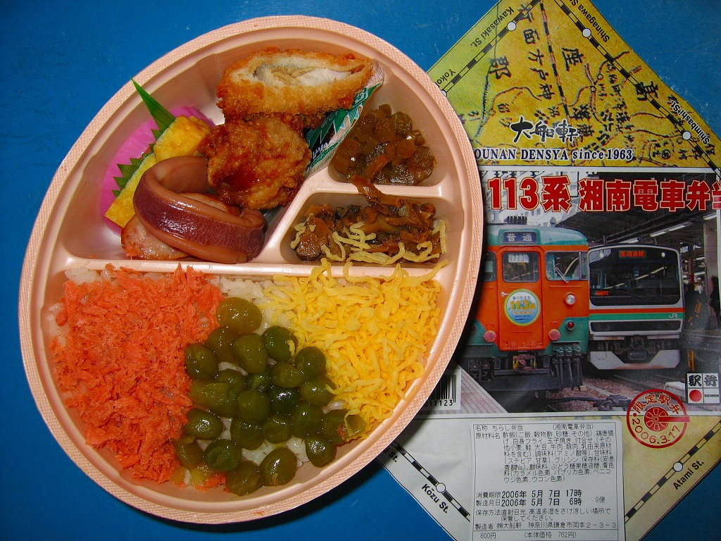 2006(平成18)年3月の東海道本線東京口からの113系電車の引退に間に合わず、4月と5月に販売された記念駅弁の5月版。大船駅弁「まぐろの浜ごはん」などでも使われる楕円形の容器に、113系電車の写真を載せた掛紙をかけ、湘南電車色の紙ひもでしばる。中身は酢飯の上に鮭フレークとウグイス豆と錦糸卵を敷き、白身魚フライ、鶏唐揚、イカ、ソーセージ、玉子焼、蒲鉾などを添える。