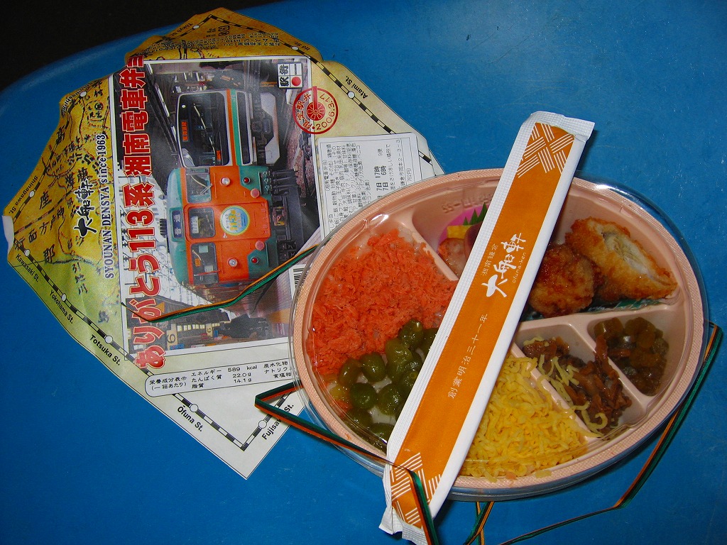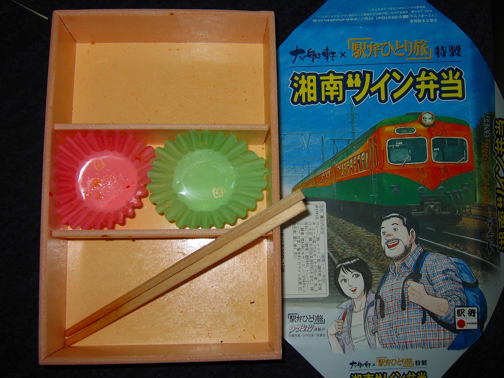 中身は鶏照焼を載せてひじきを混ぜたカレー御飯と、焼きサバとシラスを載せたトマト御飯に、玉子焼とミニ大福などを添えるもの。御飯の色で湘南電車の塗り分けを表現している。千円の駅弁でこの内容と分量ではどうかと思うが、大船の記念駅弁にしては味が無難なジャンクフード。2009年までの販売か。
