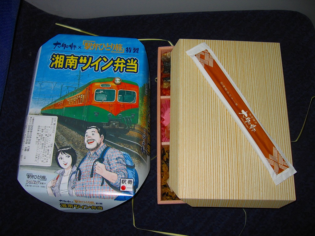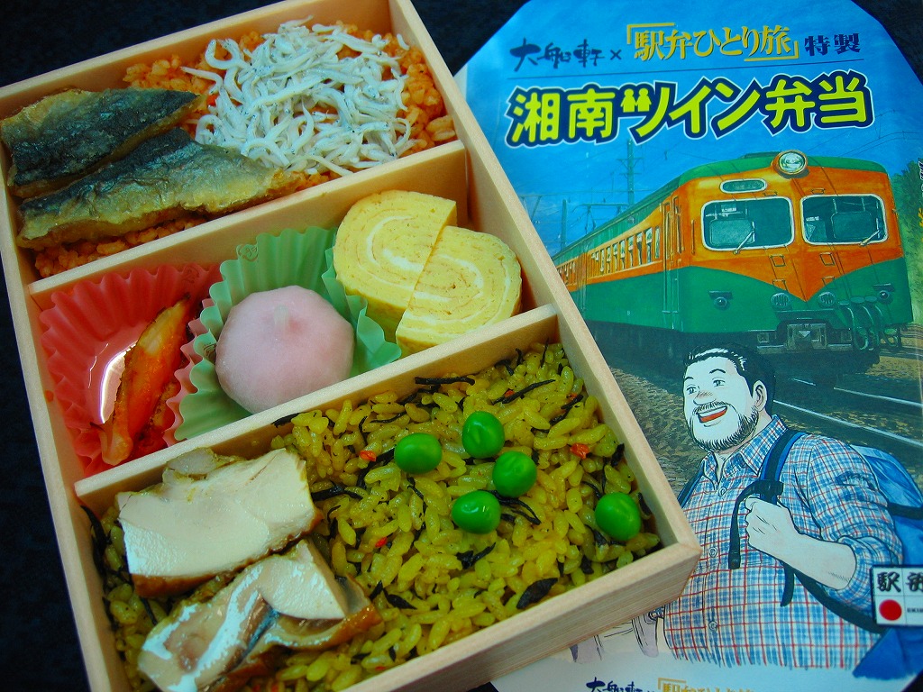 漫画アクションの連載作品「駅弁ひとり旅」とのタイアップで2008(平成20)年9月27日に発売。長方形の容器に木目柄のボール紙でふたをして、同作品の漫画家が描いた登場人物と元祖湘南電車のイラストを描いた掛紙をかけて、駅弁らしくひもで十字にしばる。