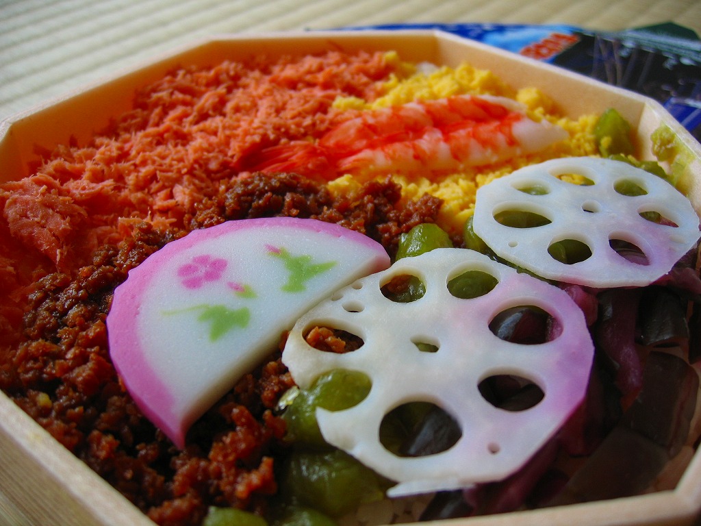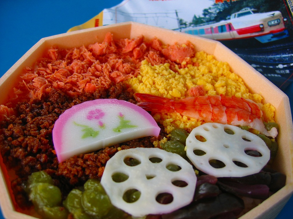 中身は酸っぱい酢飯の上を激甘の玉子そぼろ、しょっぱい鳥そぼろ、風味のない鮭フレーク、普通に甘いうぐいす豆、刺激的な柴漬等で覆い、蒲鉾とレンコンとエビを貼るもの。下記「ありがとう113系湘南電車弁当」に輪をかけた不味さは、掛紙収集と収穫報告のための駅弁。